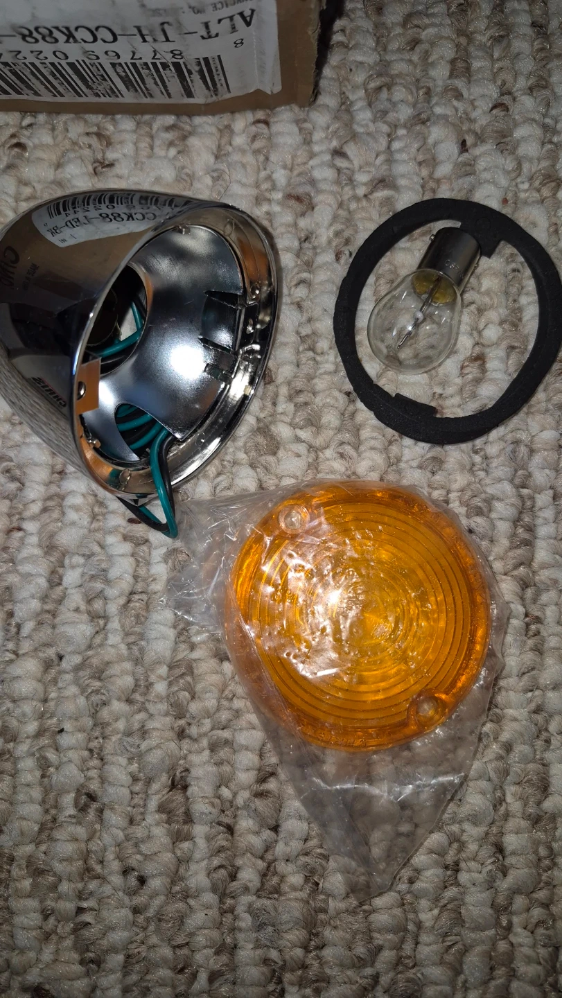 CCI chrome flat lens turn signal assembly. Includes lens, bulb, and rubber gasket. Fits most models from 1986 to present as a rear turn signal. Single filament bulb included.