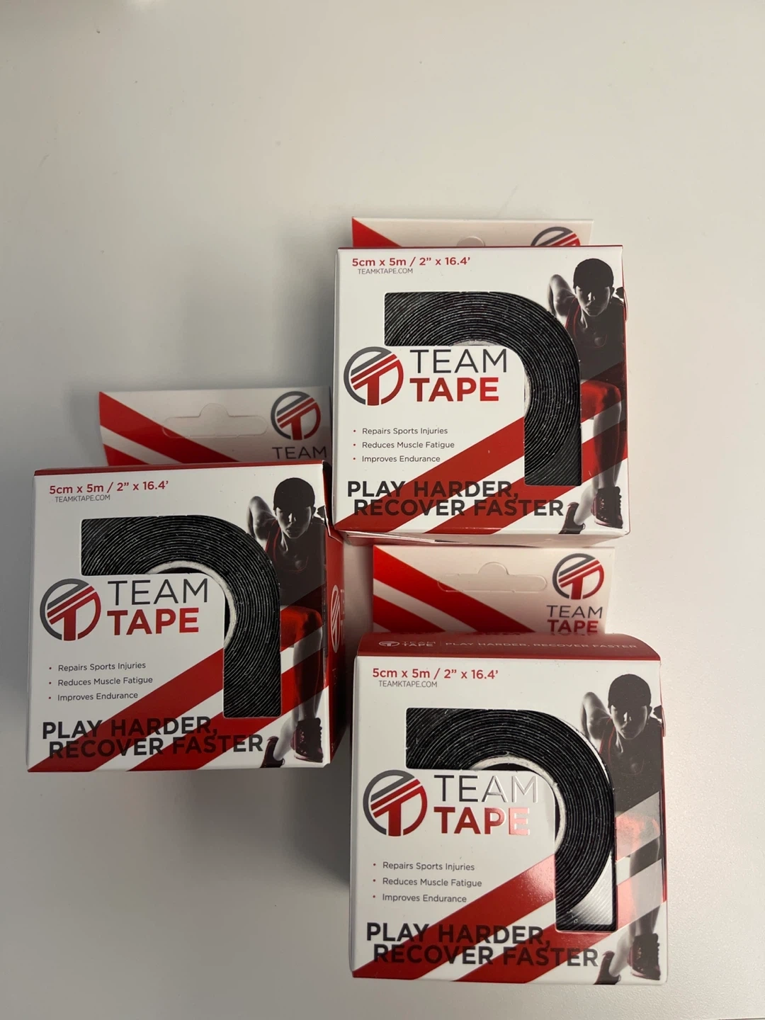 This black Team Tape is 5cm x 5m (2" x 16.4'). It's designed to help repair sports injuries, reduce muscle fatigue, and improve endurance. Get back in the game faster!