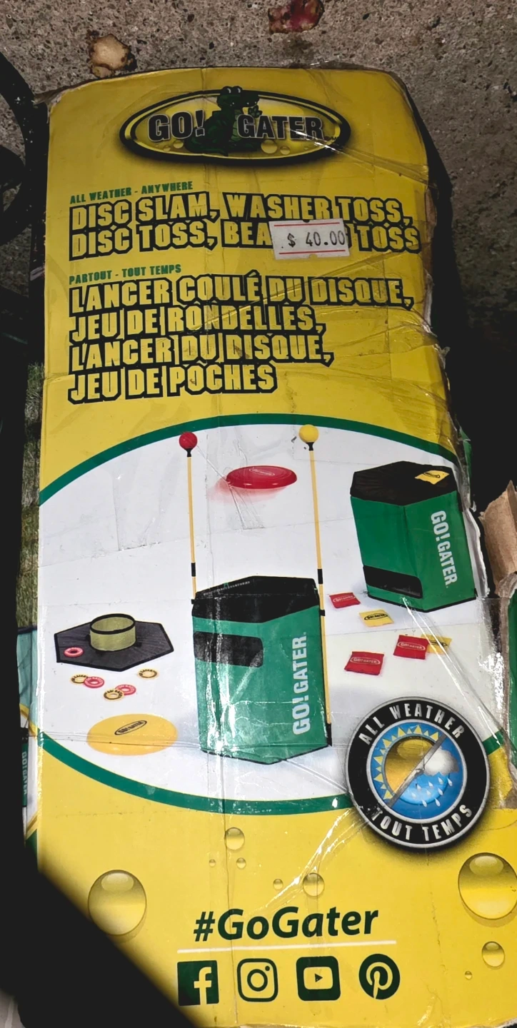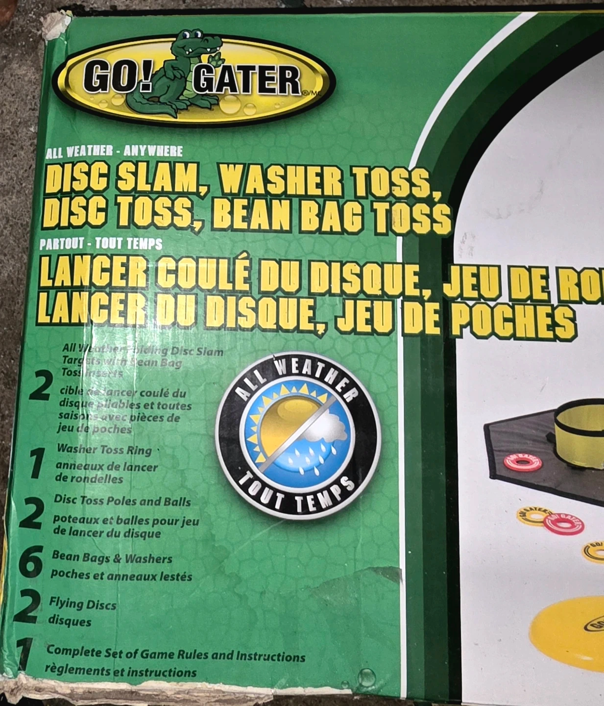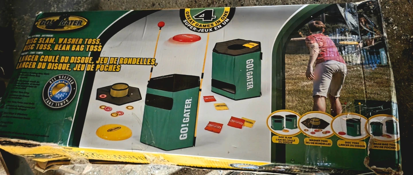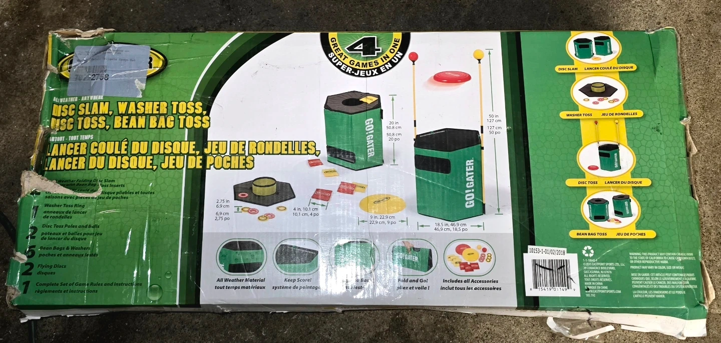 This Go! Gater game set offers four different ways to play: Disc Slam, Washer Toss, Disc Toss, and Bean Bag Toss. It's designed for all-weather use, making it great for outdoor fun. Includes flying discs, bean bags, washer toss rings, disc toss poles, balls and instructions.