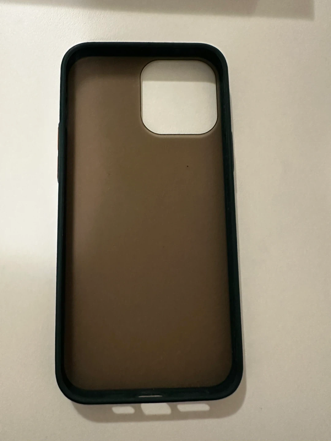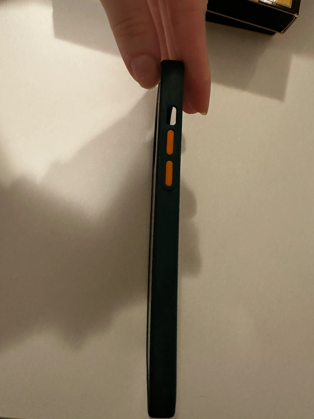 This dark green case offers a slim profile and is designed for the iPhone 11 Pro Max. It features contrasting orange buttons for easy access. It's made from a durable material to protect your phone.