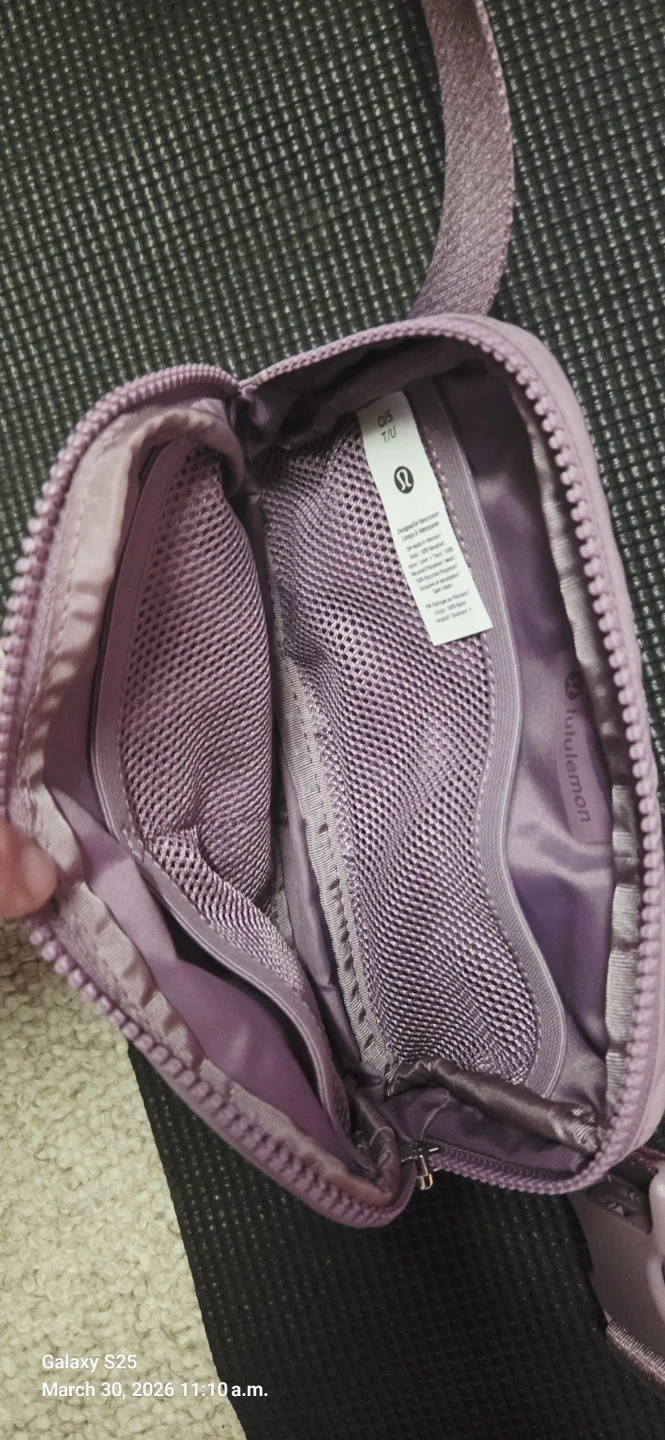 This Lululemon Everywhere Belt Bag is in a lovely lilac colour. It's made of nylon and has multiple pockets inside for organization. Perfect for carrying essentials on the go!