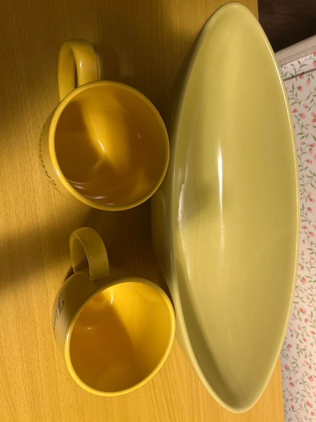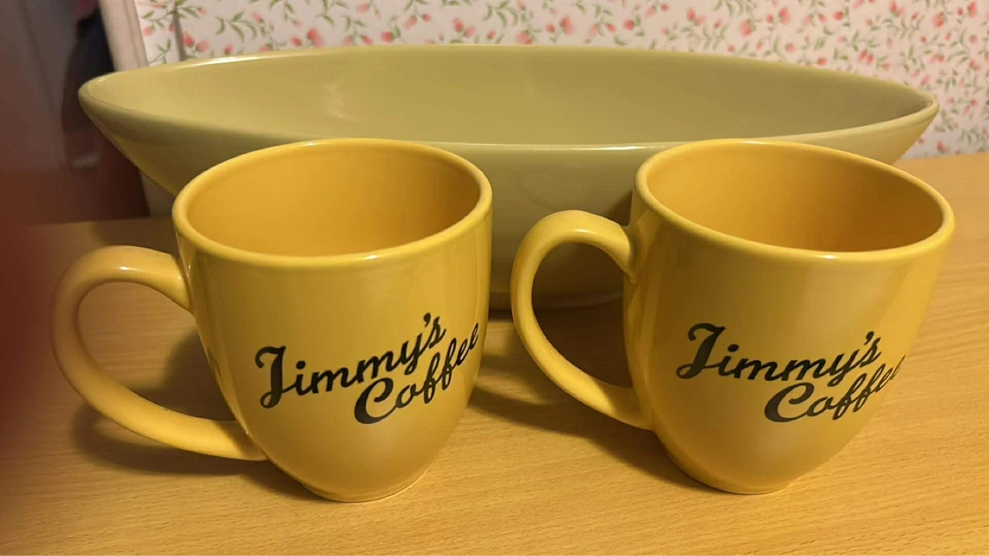 Set includes two yellow coffee mugs and a matching serving bowl. Mugs have 'Jimmy's Coffee' printed on them.