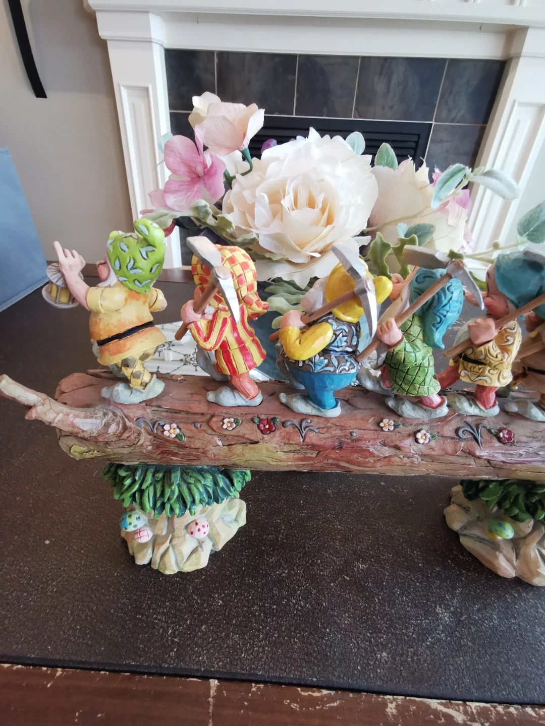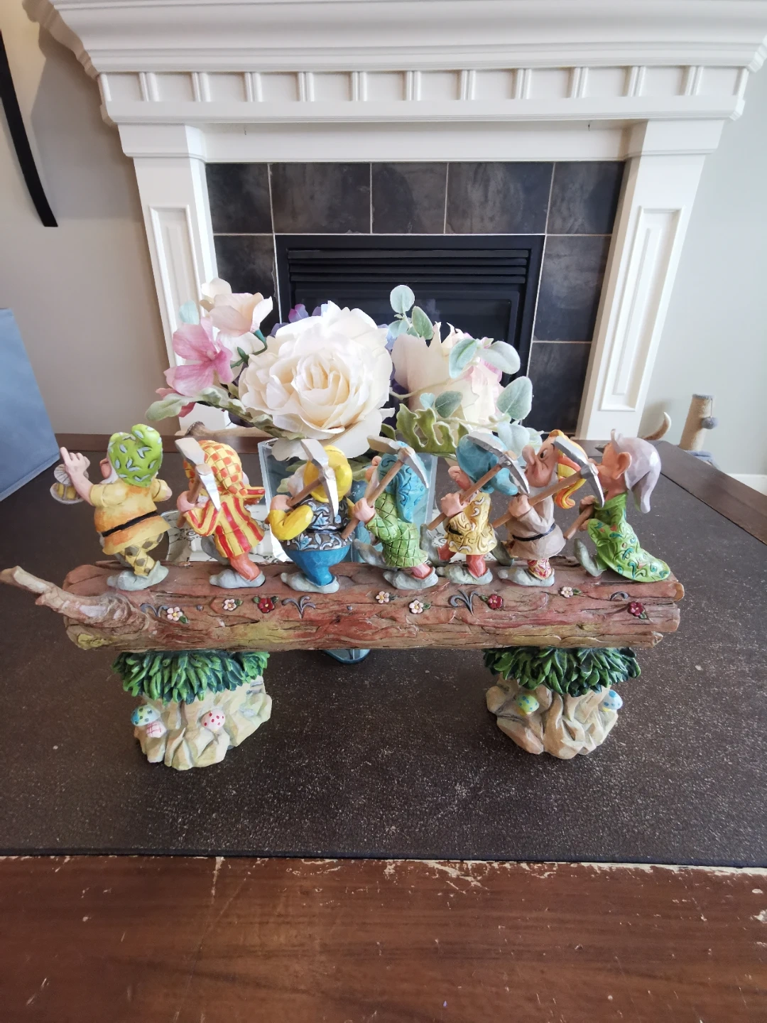 This figurine features all seven dwarfs walking along a log. It's made of painted resin and comes with faux floral accents. It's a charming piece for any Disney fan's collection.
