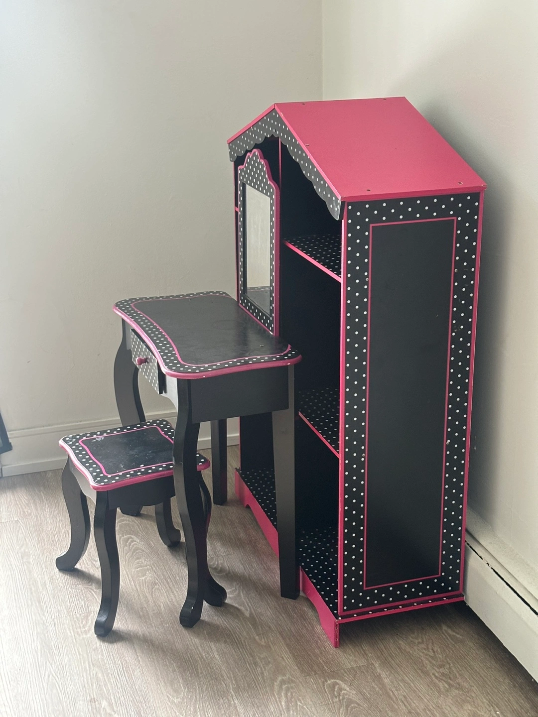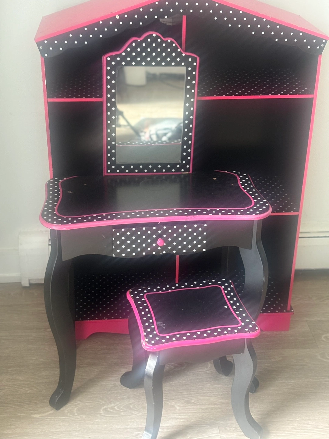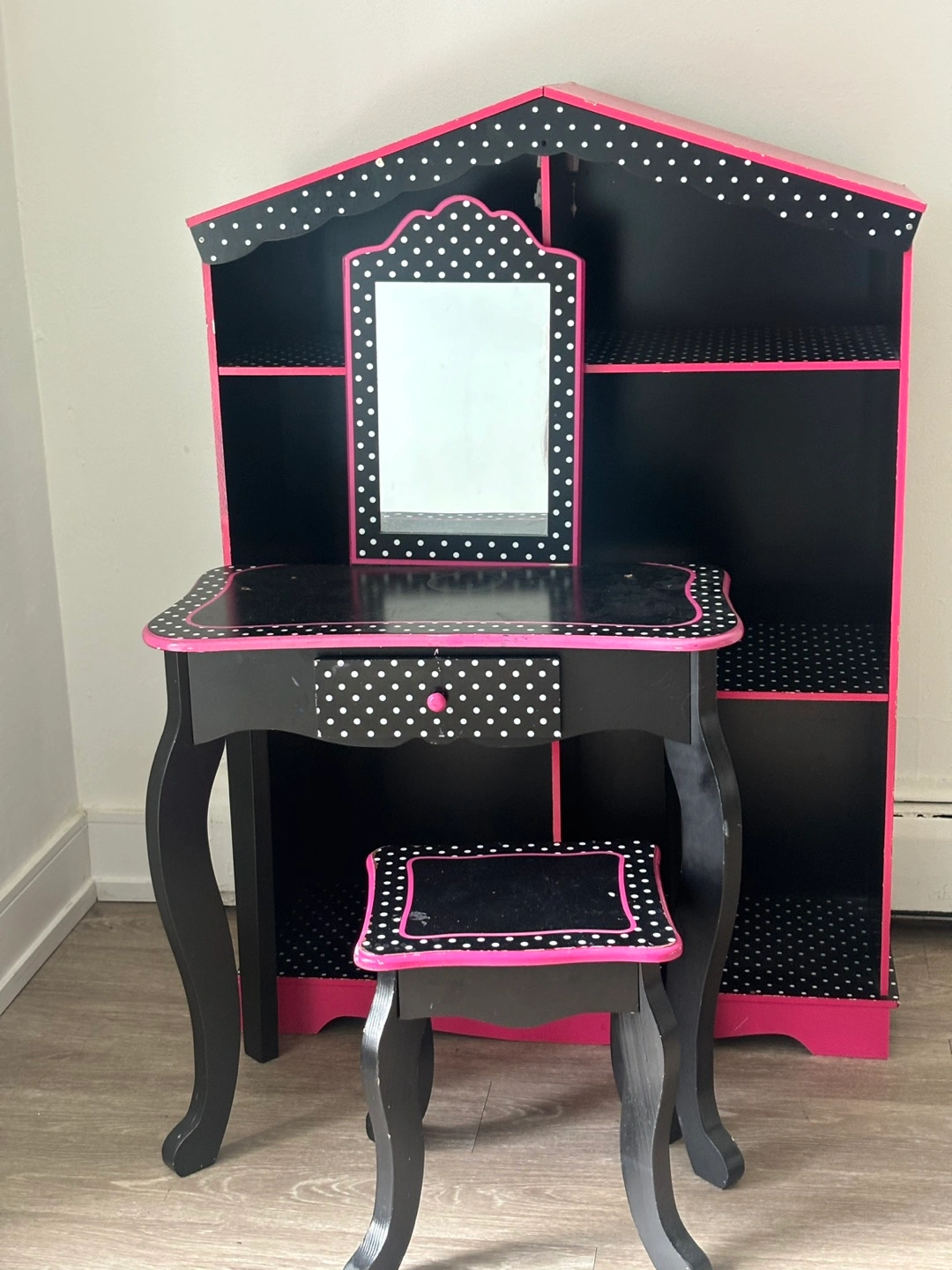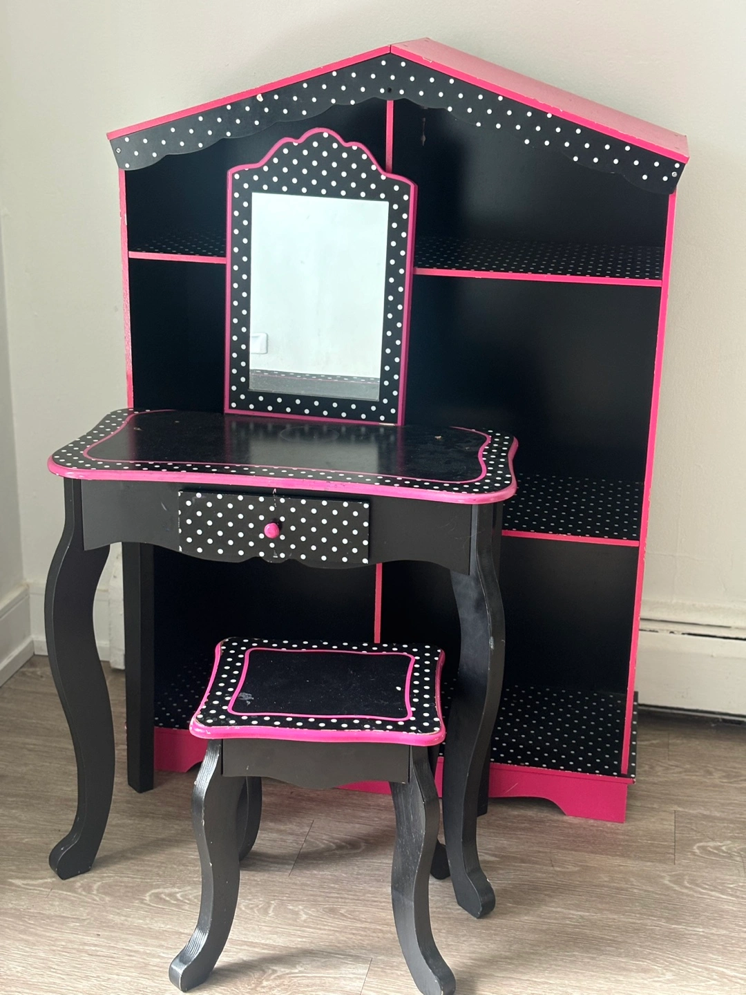 Adorable vanity set, perfect for a child's room. Features a small table with a drawer, a mirror, and a matching stool. Attached shelving unit offers extra storage. Black and pink polka dot design. Excellent condition.