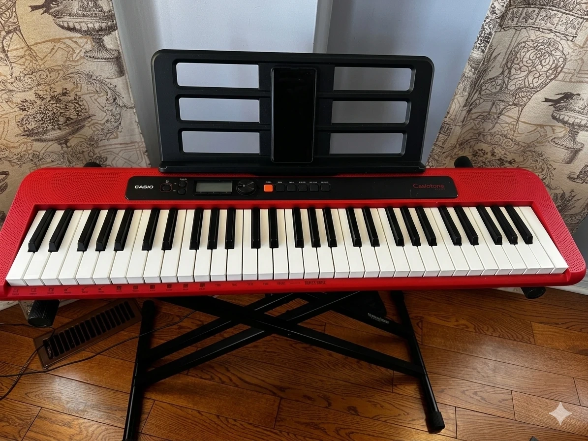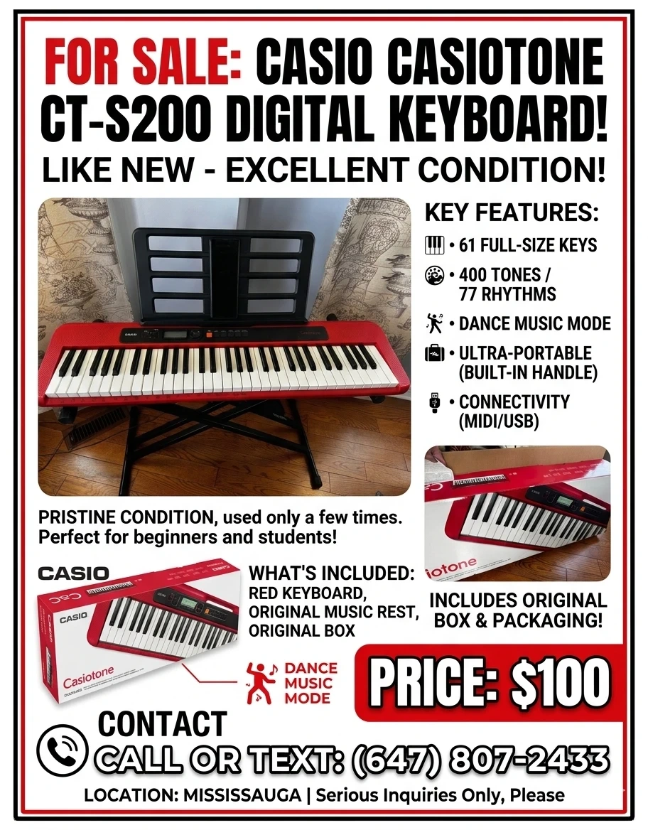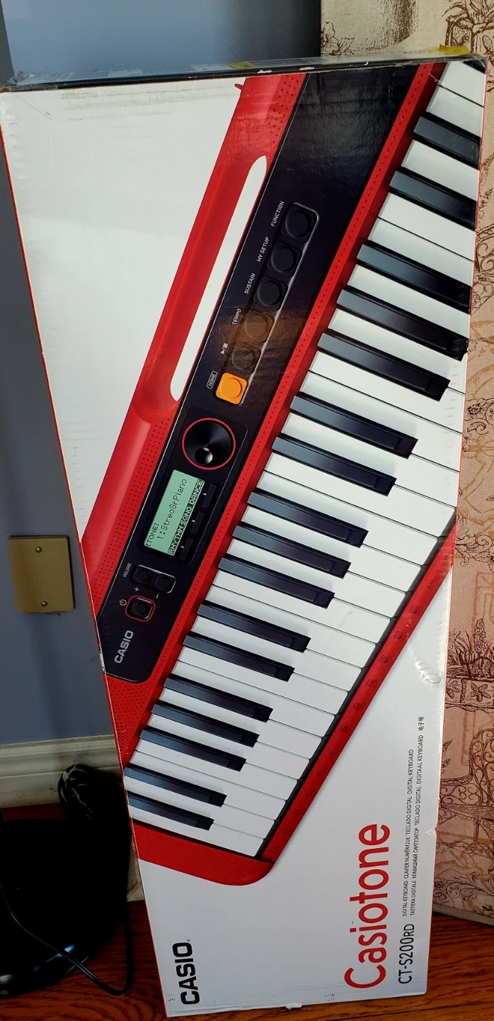 Newly bought it for$180+ tax. Only 2 months old. Everything in the box.Red Casio Casiotone CT-S200 keyboard with 61 full-size keys. It's in pristine condition and includes the original box and music rest. This keyboard is ultra-portable with a built-in handle and offers 400 tones and 77 rhythms.