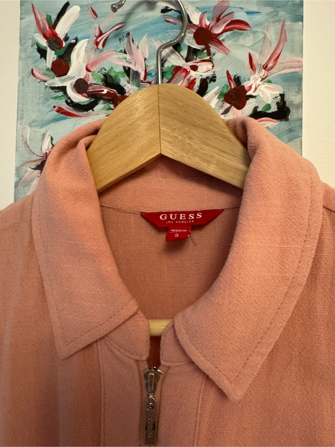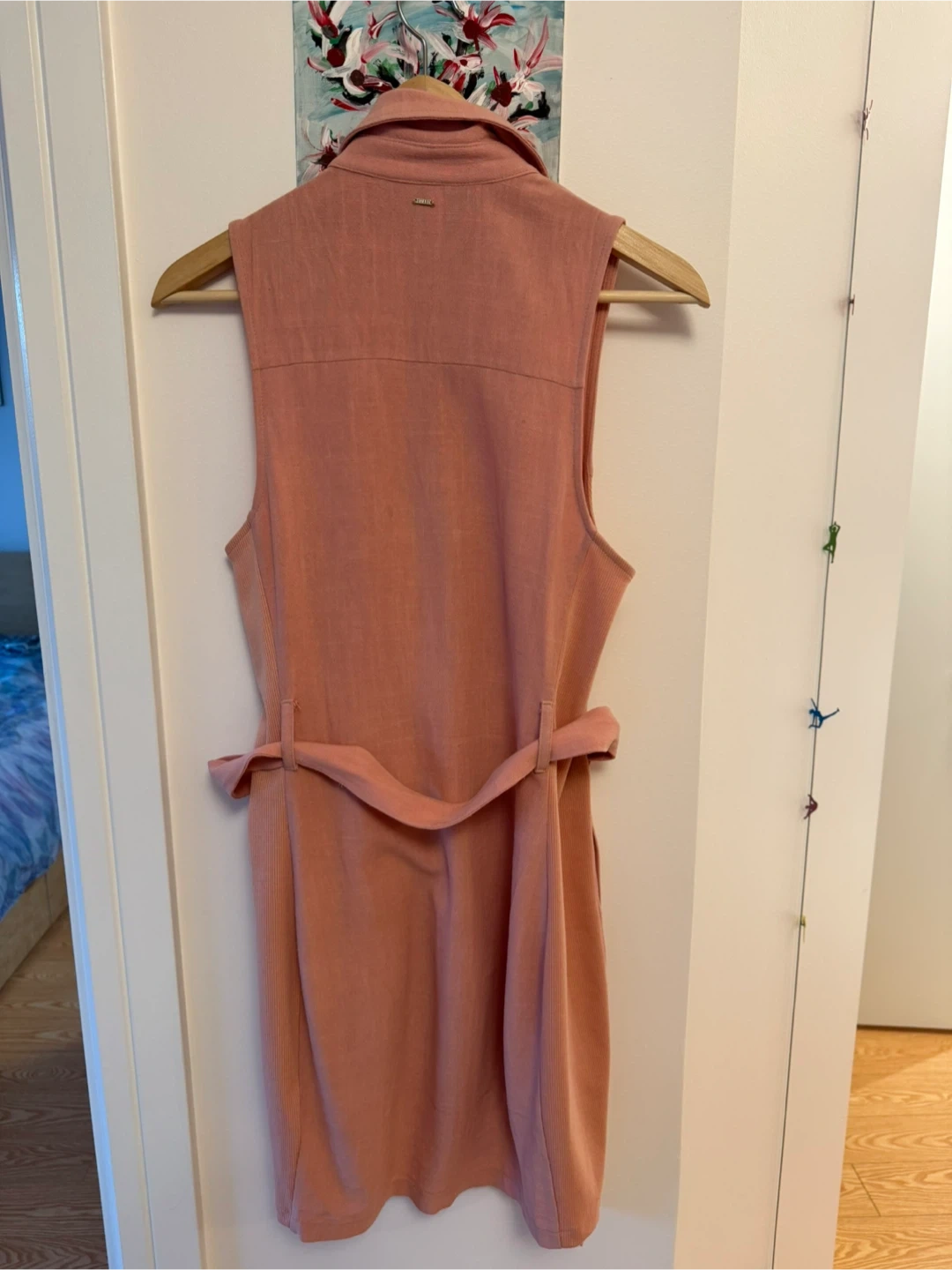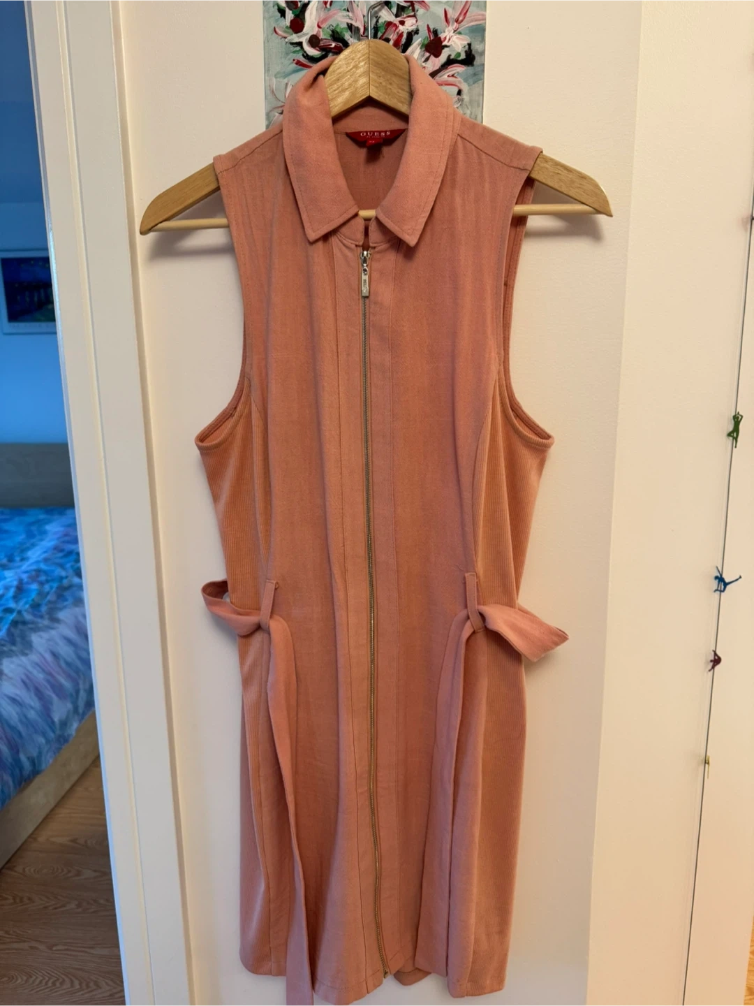 Here's a cute Guess sleeveless dress in a lovely pink colour! It features a zip-up front and a tie around the waist. The size is S.