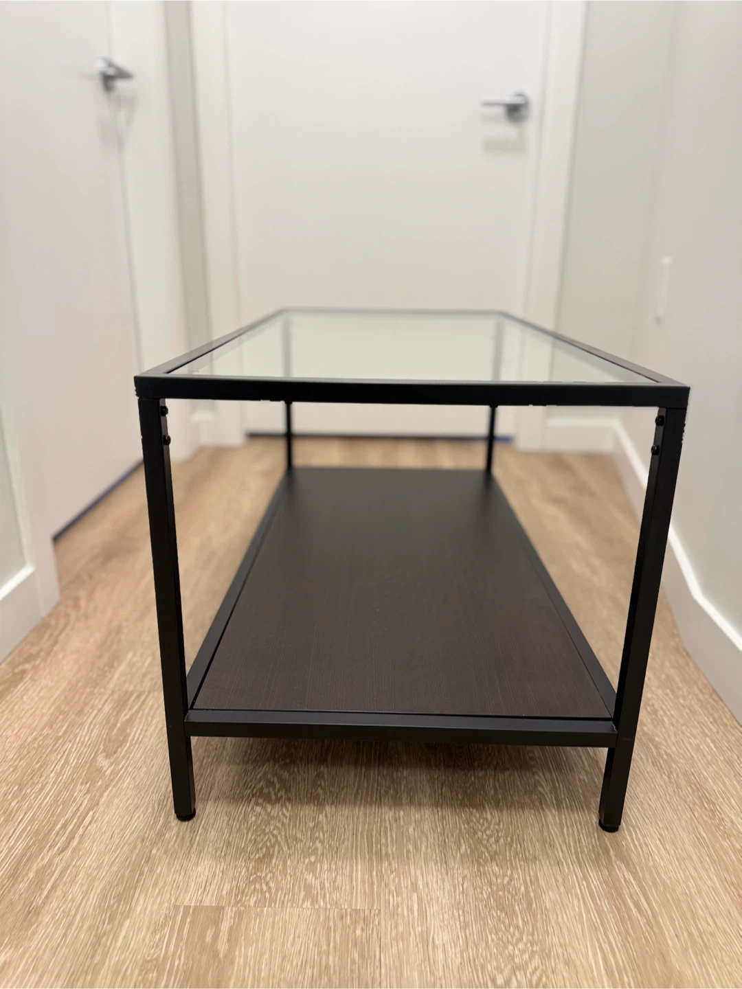This coffee table features a sleek glass top and a dark wood-look shelf. Its metal frame provides a sturdy and contemporary design. Perfect for a living room or lounge area.