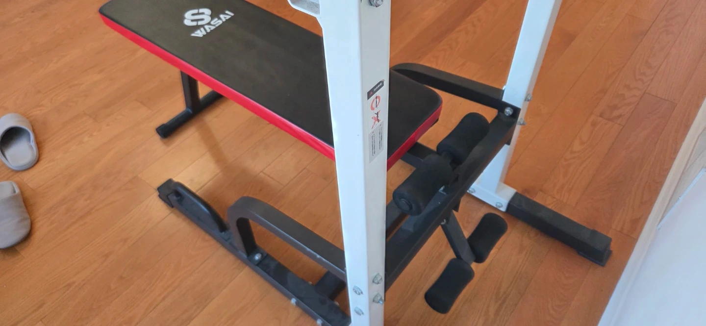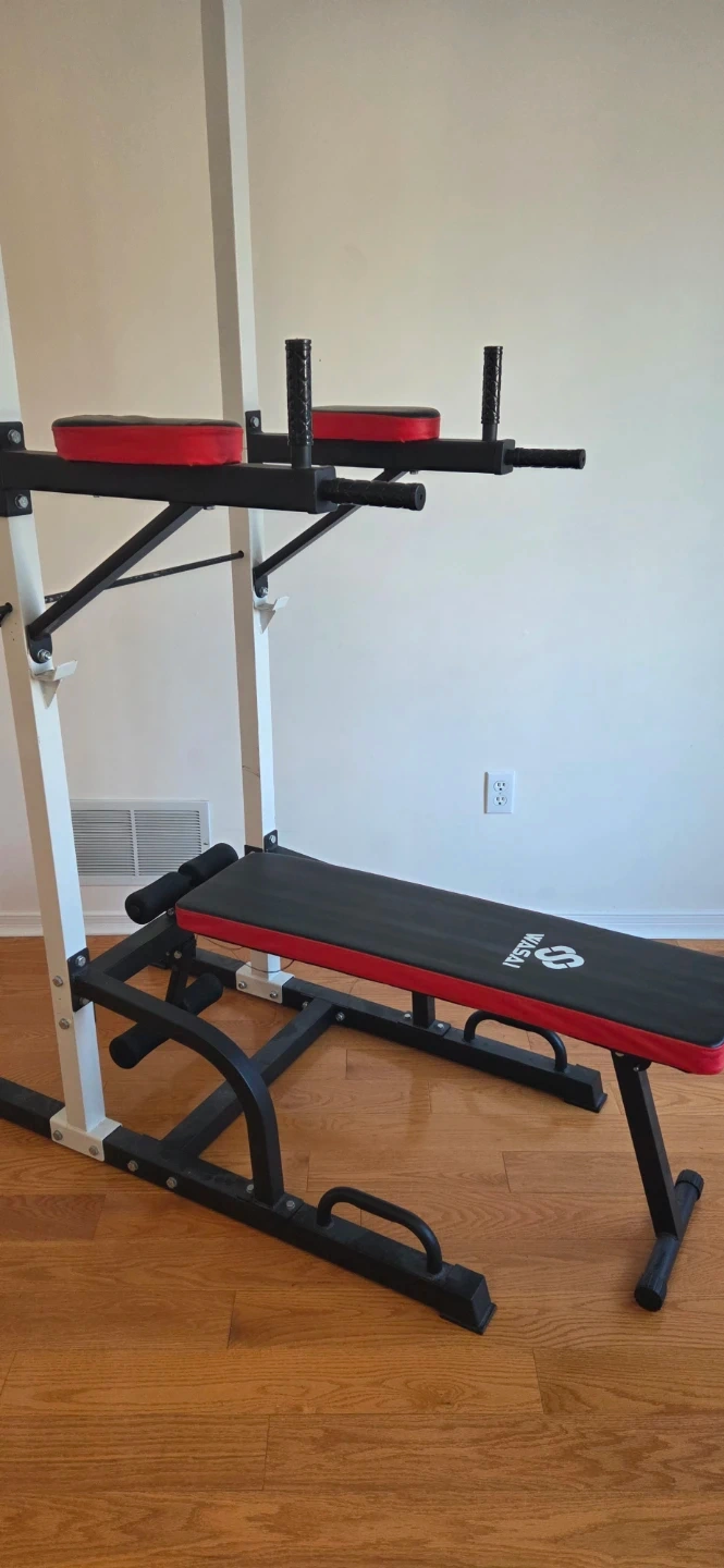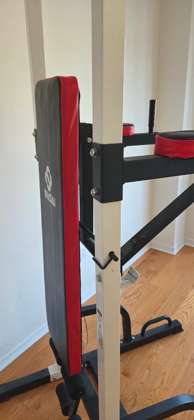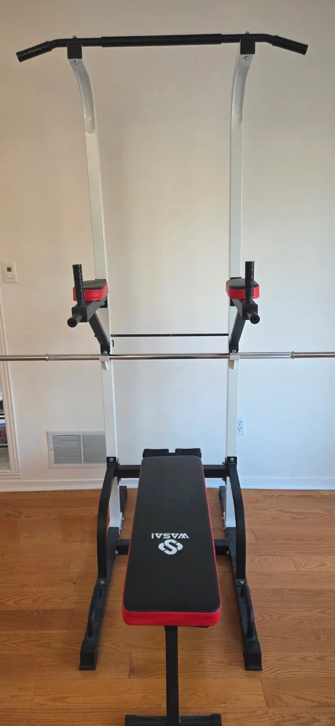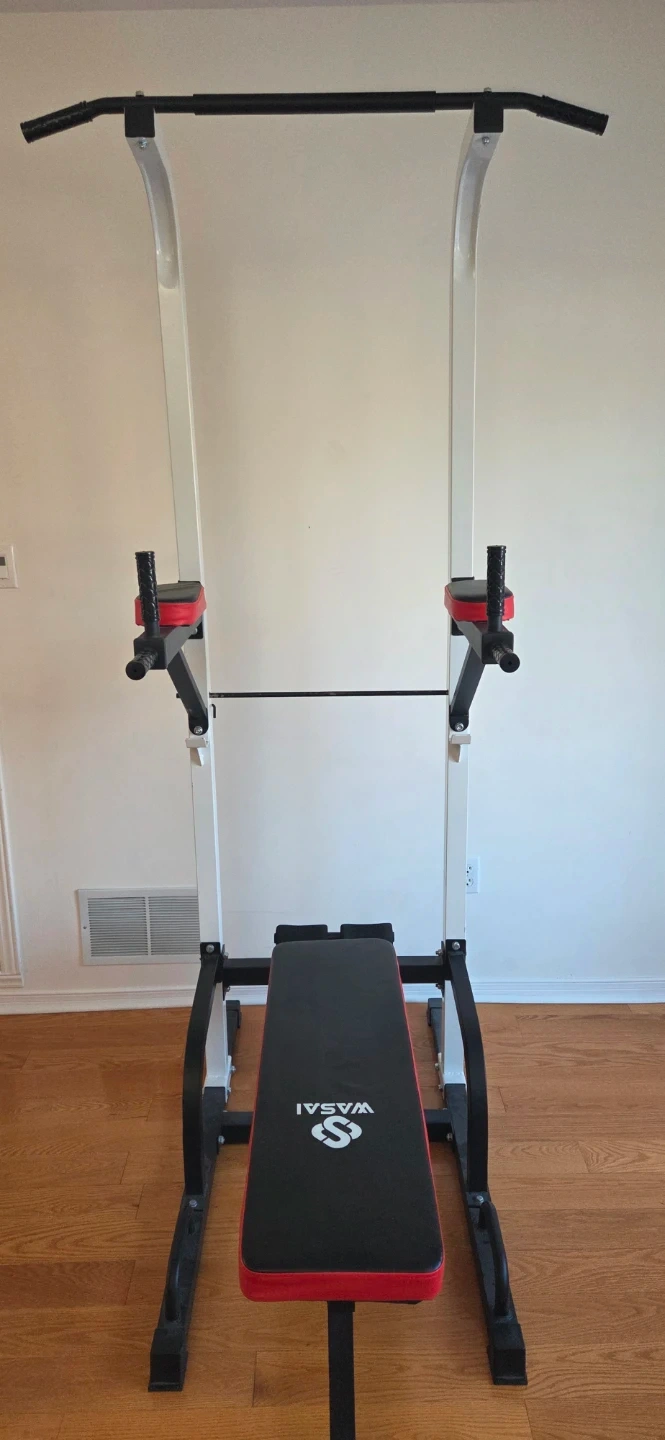 This Wasai power tower features a multi-grip pull-up bar and dip station. It includes a padded bench for exercises. Steel construction with comfortable padding.