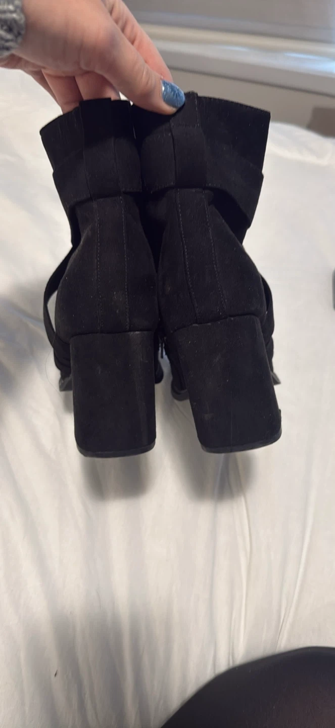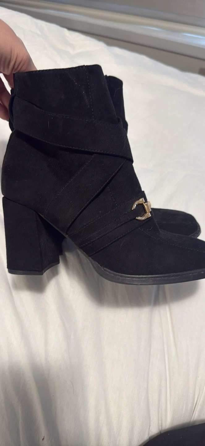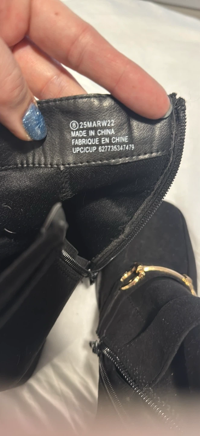 Selling a pair of Time & Tru ankle boots in black. They feature a stylish design with gold-tone hardware. The size is US 8. The manufacturing date on the boots is 2022 March 25