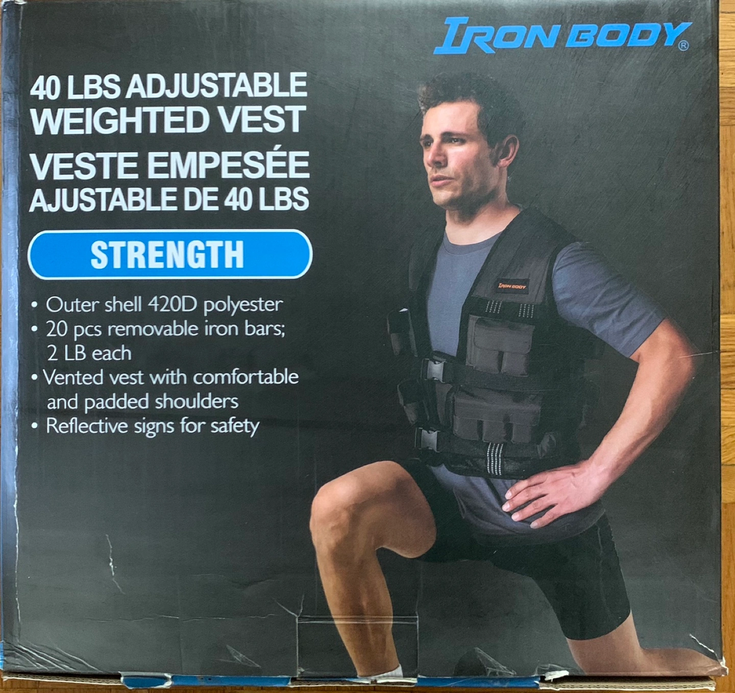 Adjustable weighted vest, 40 lbs total. 20 removable iron bars, 2 lbs each. Vented vest with comfortable and padded shoulders. Reflective signs for safety.