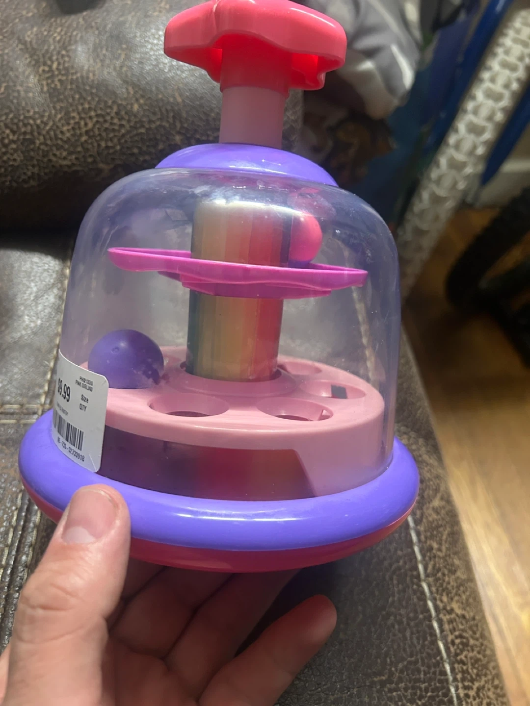 This colorful spinning top toy features a central mechanism with rainbow colors. It includes small balls that move inside the clear dome when spun. It's made of plastic and is designed for fun and engagement.