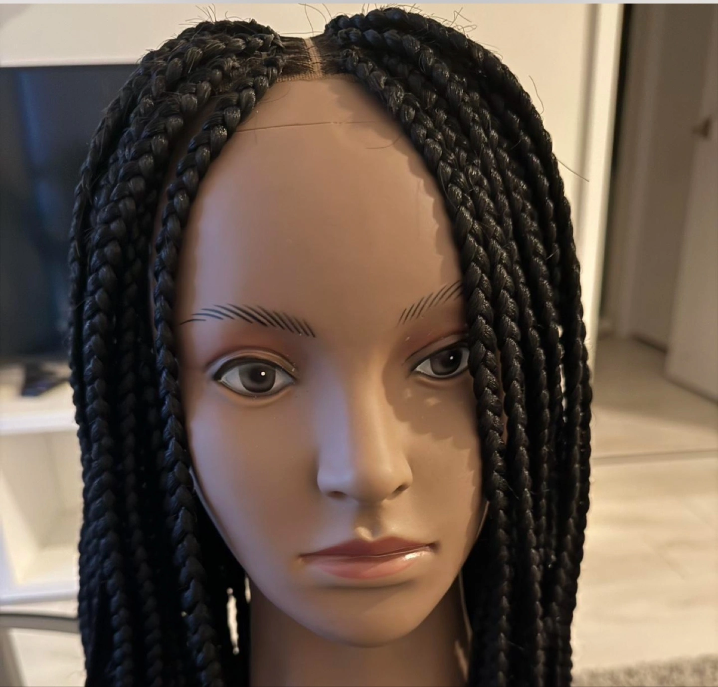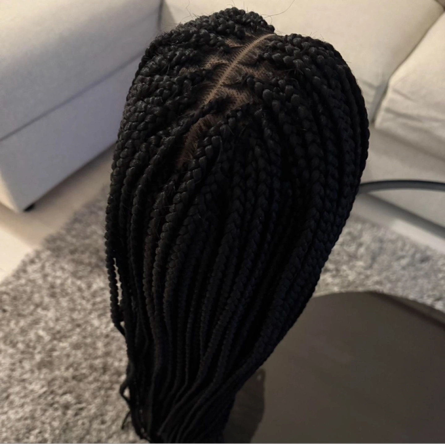 51Stylish easy to wear black knotless braided wig. Perfect for a chic look and not heavy on head. Lenght is long. Brand new, wig cap has a sturdy band.