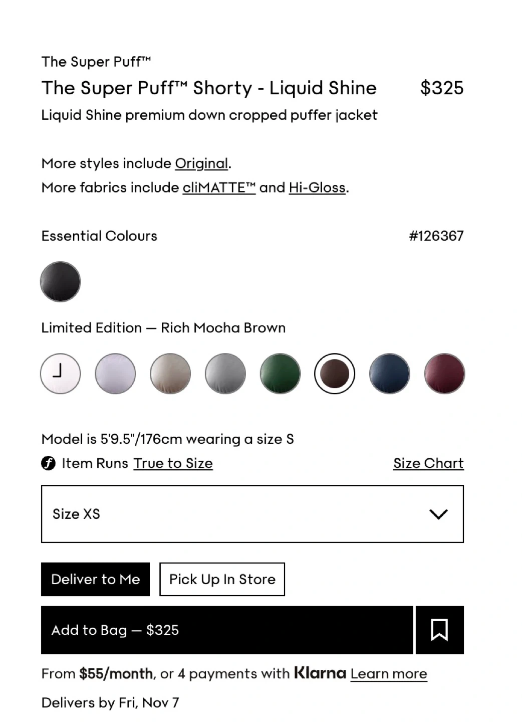 65Selling an Aritzia Super Puff Shorty in the limited edition Rich Mocha Brown colour. It's a size XS. This is a premium down cropped puffer jacket with a liquid shine finish. Originally bought for $325! I bought 2 puffer and decide to keep the other one! Dm for ur ideal price! Pick up only!