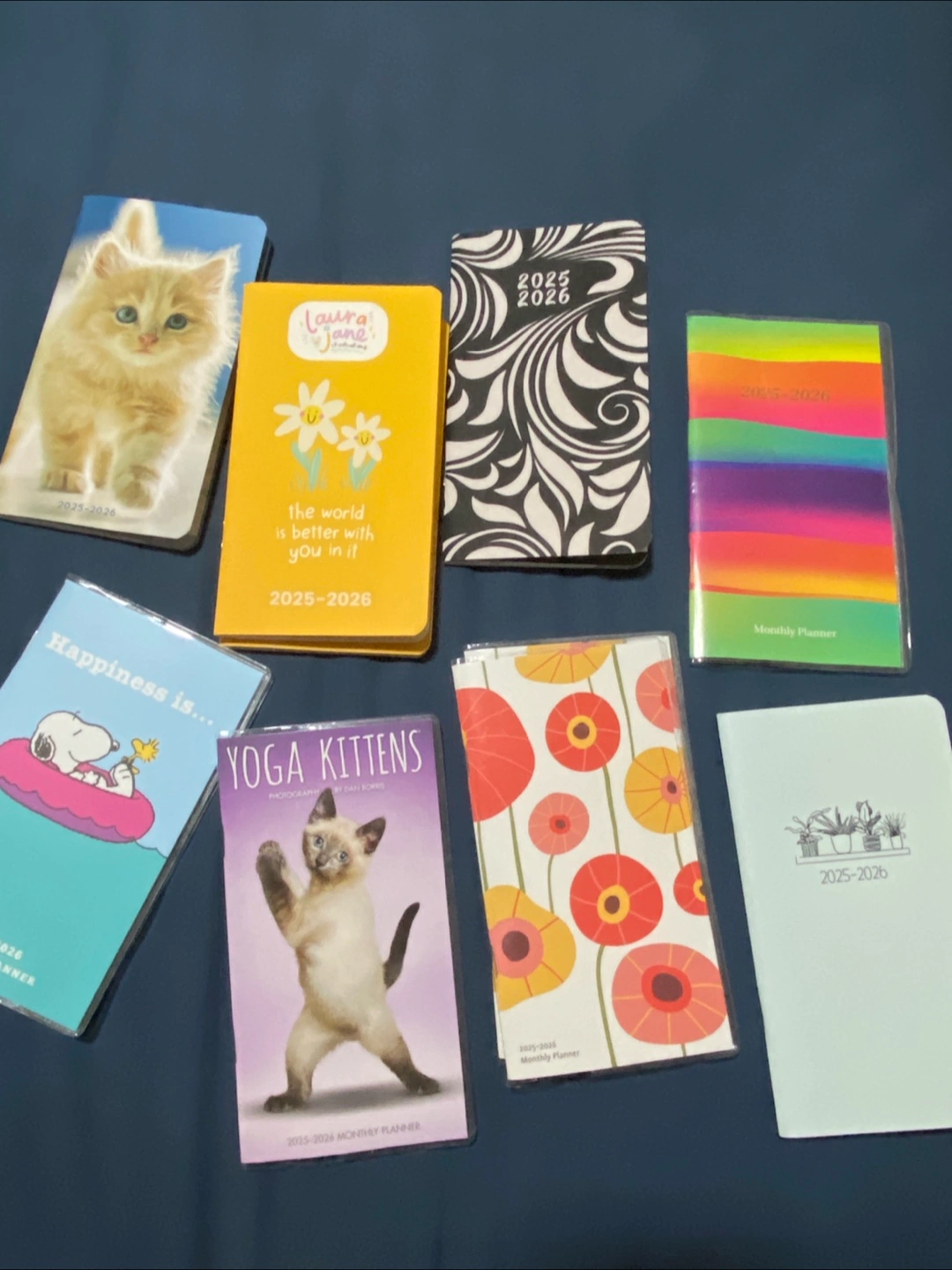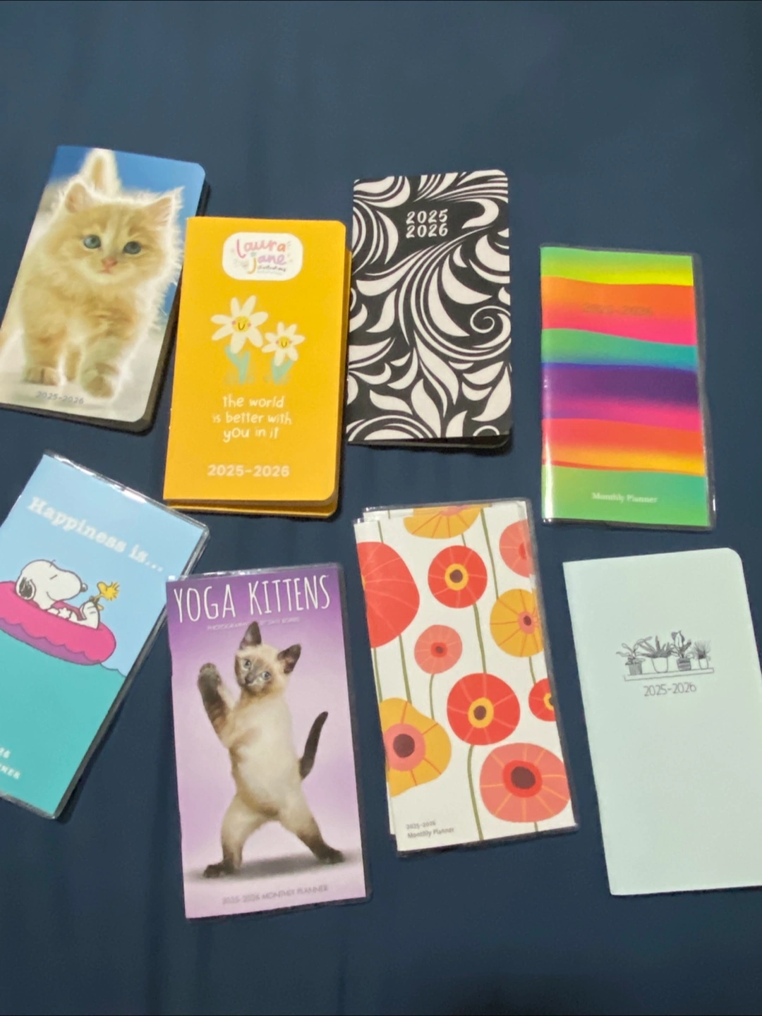Stay organized in style with these adorable and compact 2-year planners! Perfect for students, professionals, or anyone who loves staying on top of their schedule. 📅 Features: • Covers July 2025 to June 2026 • Monthly calendar layout • Holidays and special dates marked (Canada, USA & more) • Compact, fits easily in purses, pockets, or bags • Great for school, work, or home planning 🎨 Available Designs: • Cute Kitten • Yellow Floral (says “The world is better with you in it”) • Black & White Swirl • Rainbow Stripes • Snoopy “Happiness is…” • Yoga Kittens • Red & Orange Flowers • Minimalist Plant Design