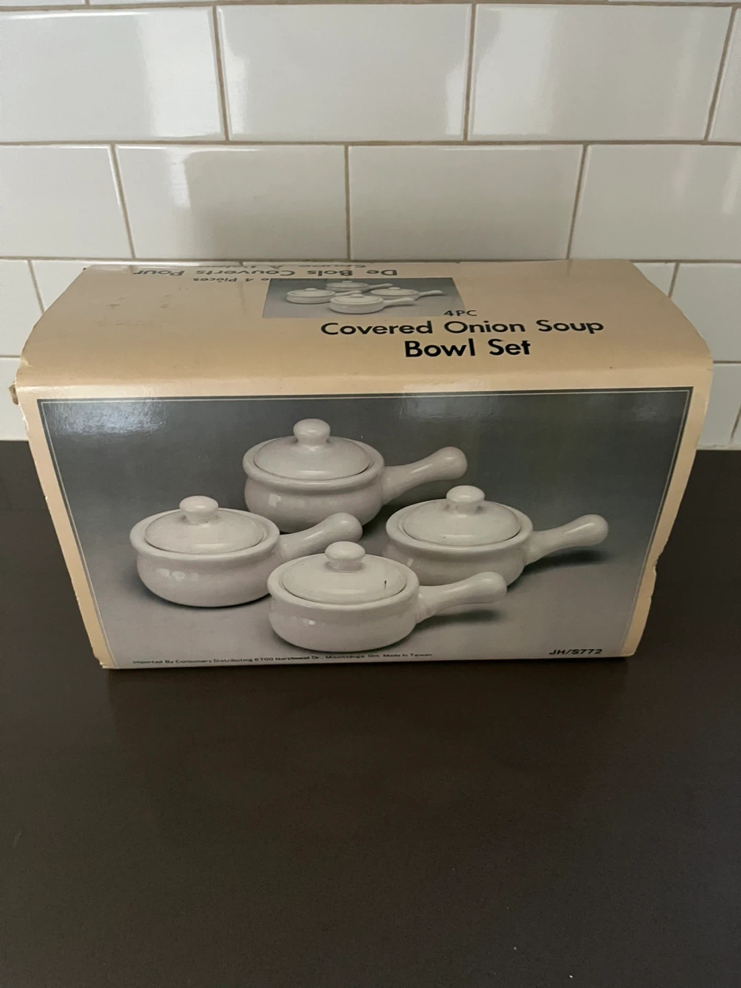 Pick up in Utopia. Selling a 4-piece covered onion soup bowl set! Never been opened. Perfect for serving up some delicious soup on a chilly day