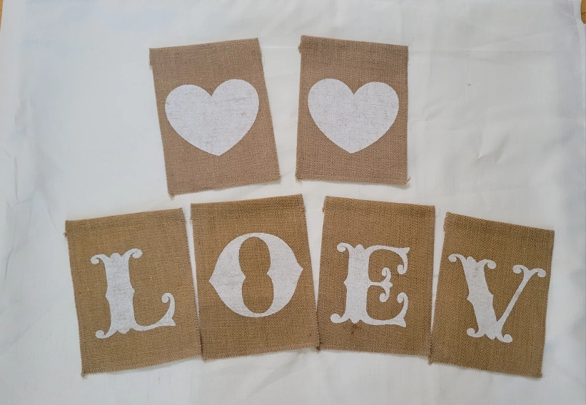 70Brand new, never been used. Cute burlap banner with the letters L, O, V, E and two hearts. Each individual Burlap is 5.75"x7.75". they can be arranged to display any way you want Perfect for a wedding, Valentine's Day, or just to add some love to your home decor