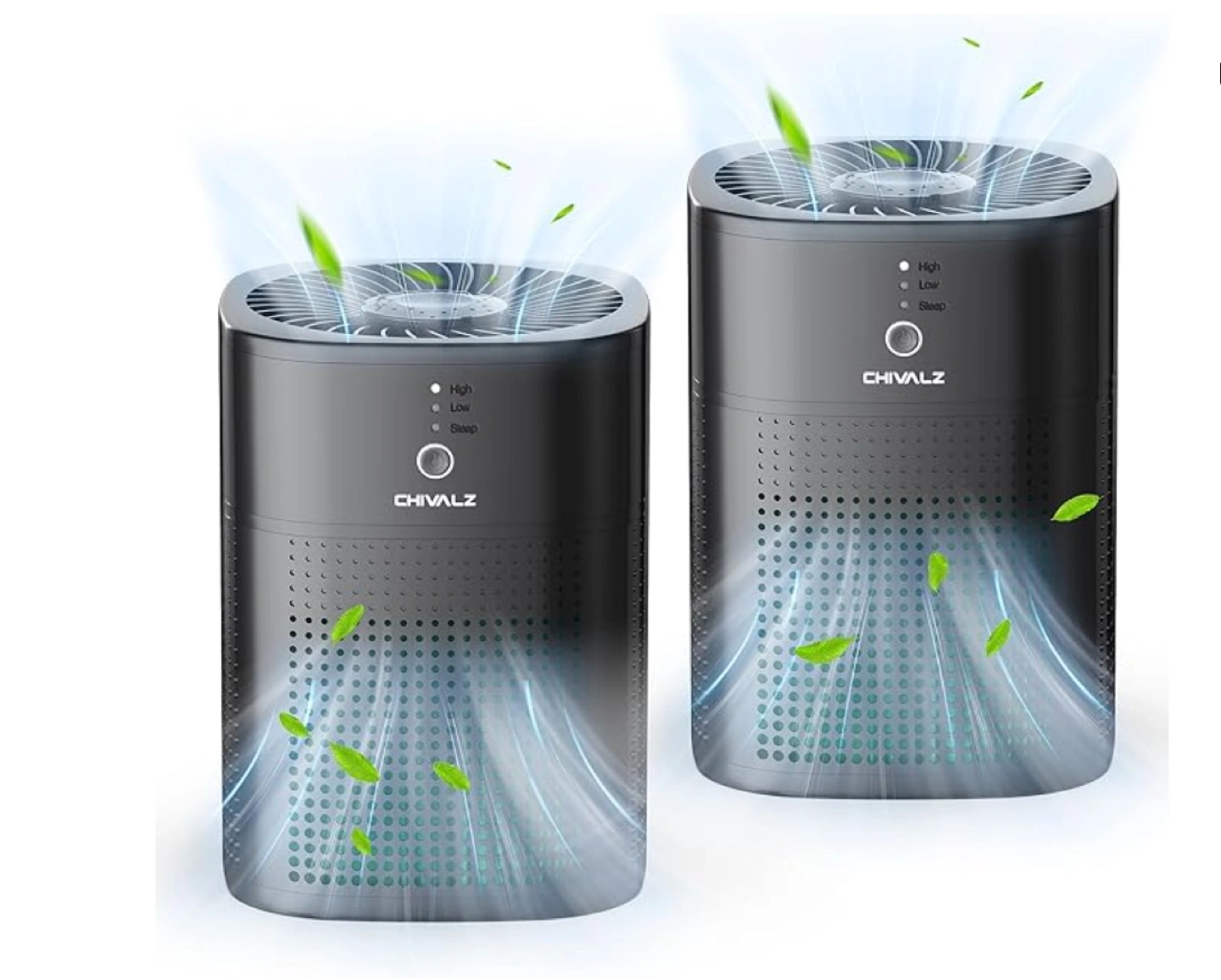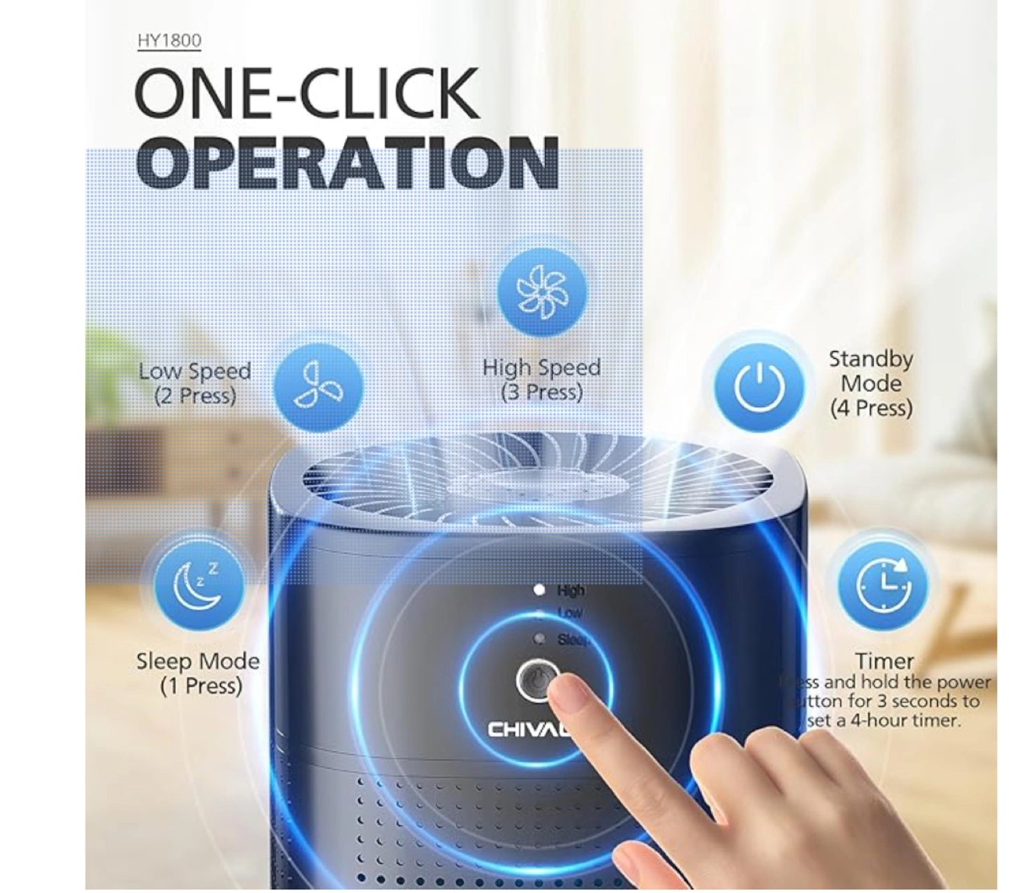 Compact air purifier. Three-stage filtration system. Activated carbon filter, True HEPA filter, and pre-filter. Aromatherapy function. One-click operation. Sleep mode. Timer function. Covers up to 752 sq ft.