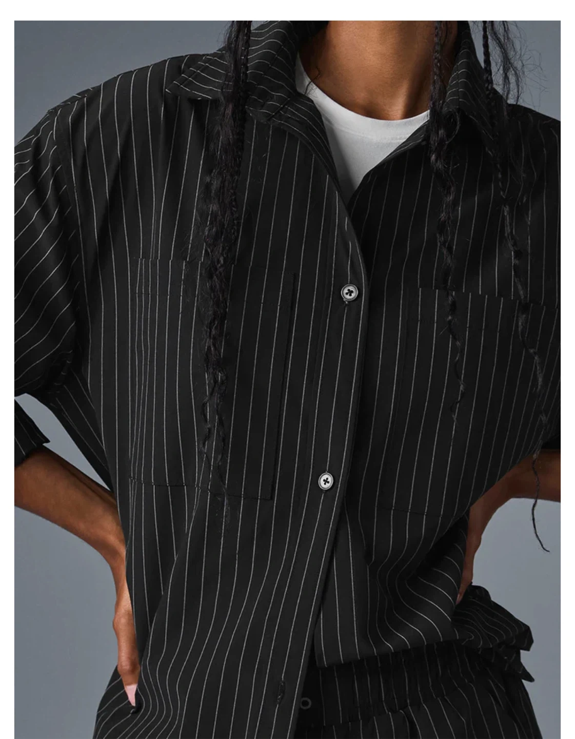 10Here's a stylish and never worn navy striped button-down shirt from Alo. It features a classic design with front pockets, perfect for adding a touch of sophistication to any outfit. Great for layering or wearing on its own!
