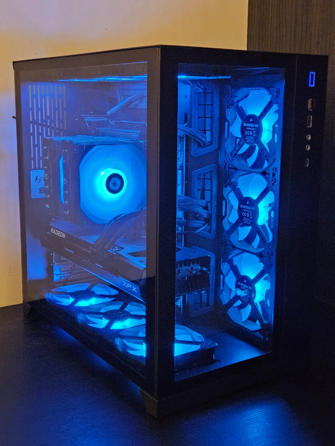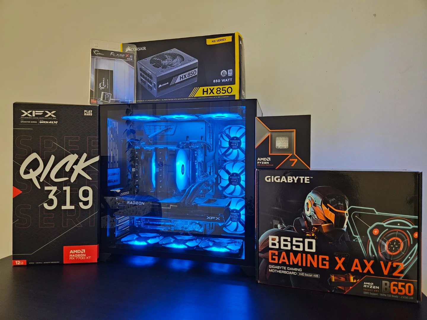 10Brand New AMD gaming PC Everything is under warranty Comes with receipts, all boxes and accessories. Specs- CPU - Ryzen 7 9700X MB - Gigabyte B650 Gaming X AX V2 GPU - XFX 7700XT - 12 GB RAM - DDR5 32GB @ 6000 - GSkill Flair X5 COOLER - Thermalright Phantom Spirit 120 ARGB dual tower PSU - Corsair fully Modular HX850W CASE- Lian Li Dynamo Case FANS - 9 x Corsair iCUE SP120 ARGB PRO Performance FOR RGB - 2 x Corsair iCUE commander core controllers for RGB and Fans. NO STORAGE You can test it before buying and comes with free Lenovo Keyboard