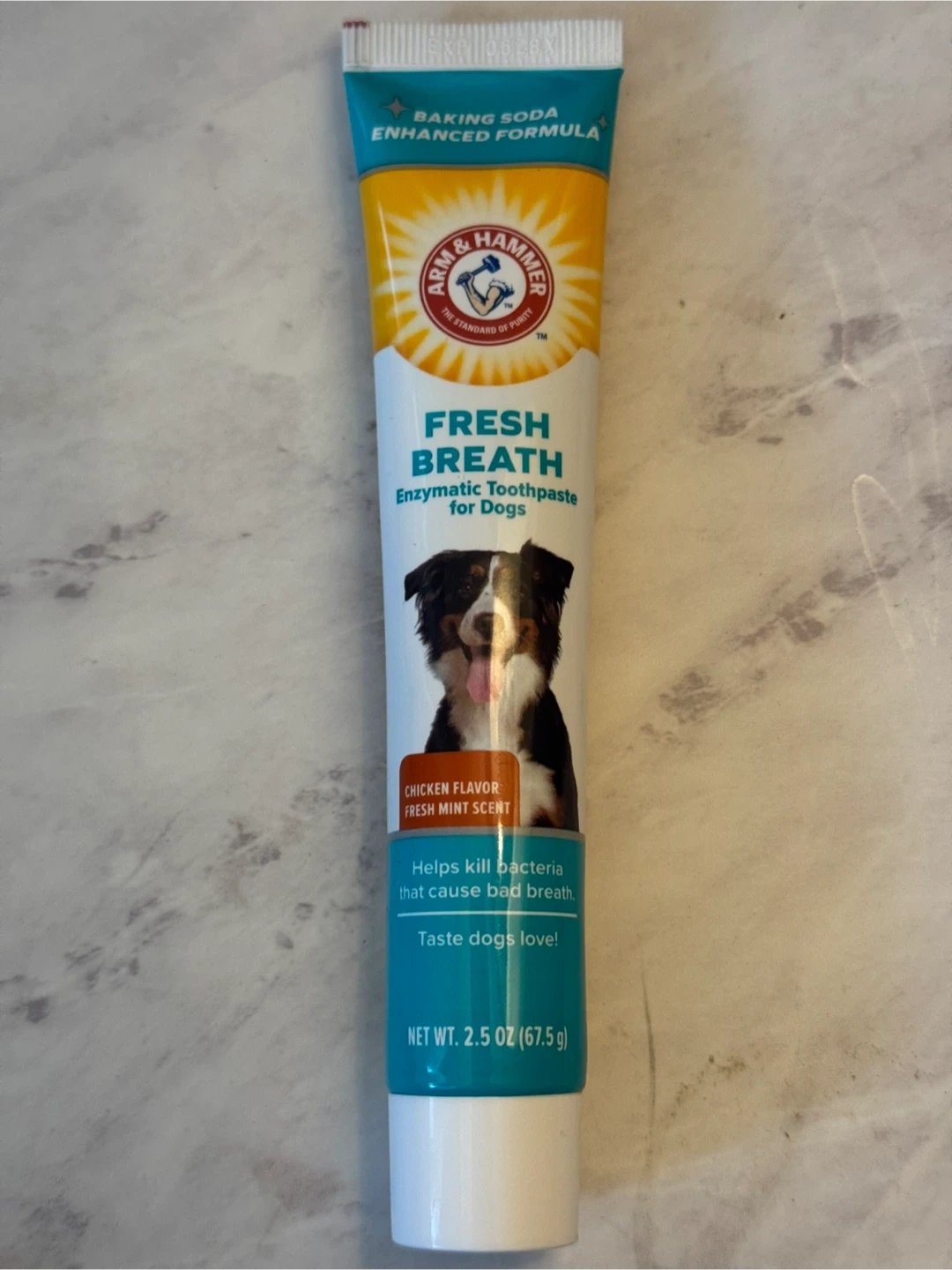 555Selling a brand new, never used, tube of Arm & Hammer Fresh Breath Enzymatic Toothpaste for Dogs. It's a chicken flavour with a fresh mint scent, perfect for keeping your furry friend's breath fresh. Net weight is 2.5 oz (67.5 g). Expire June 2028! Bought the wrong toothpaste for my kitten.