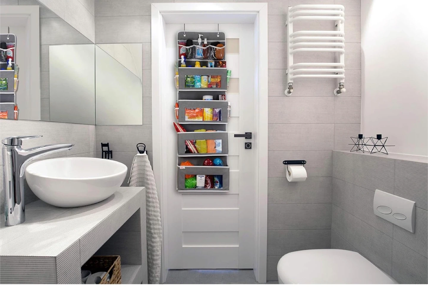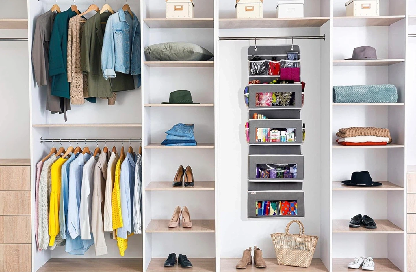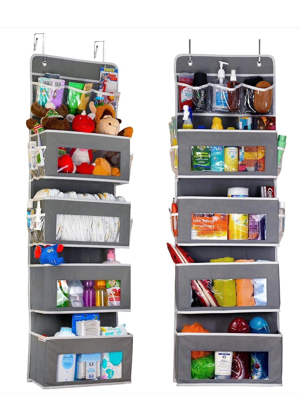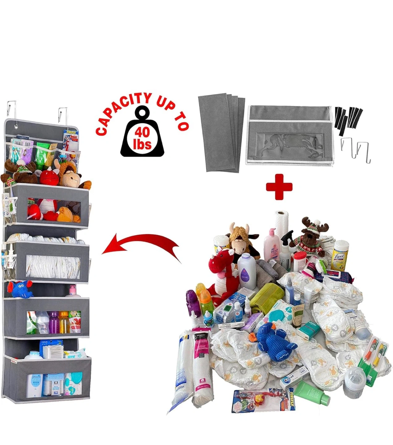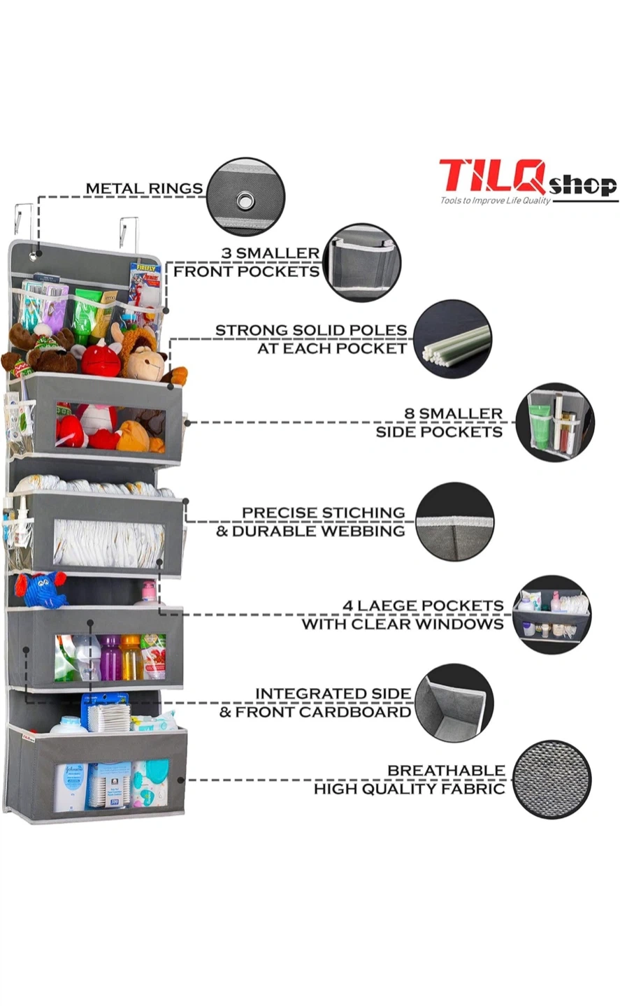 92Declutter your space with this handy over-the-door hanging organizer! It features: - Metal rings for easy hanging - 3 smaller front pockets - Strong solid poles at each pocket - Precise stitching and durable webbing - 4 large pockets with clear windows - Integrated side and front cardboard - Breathable high-quality fabric It can hold up to 40 lbs, perfect for toys, diapers, toiletries, and more!