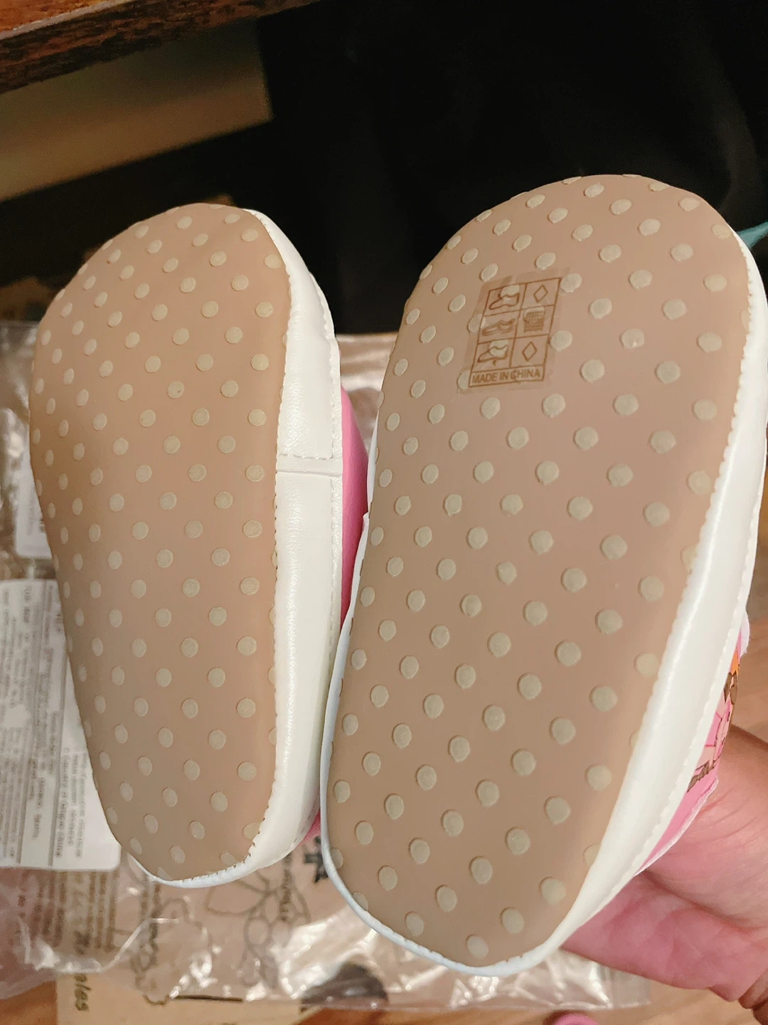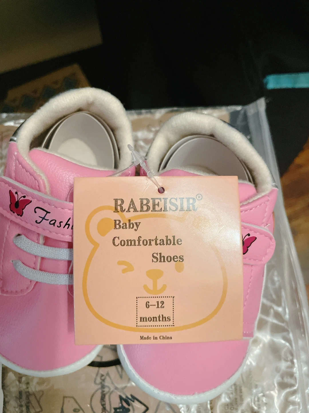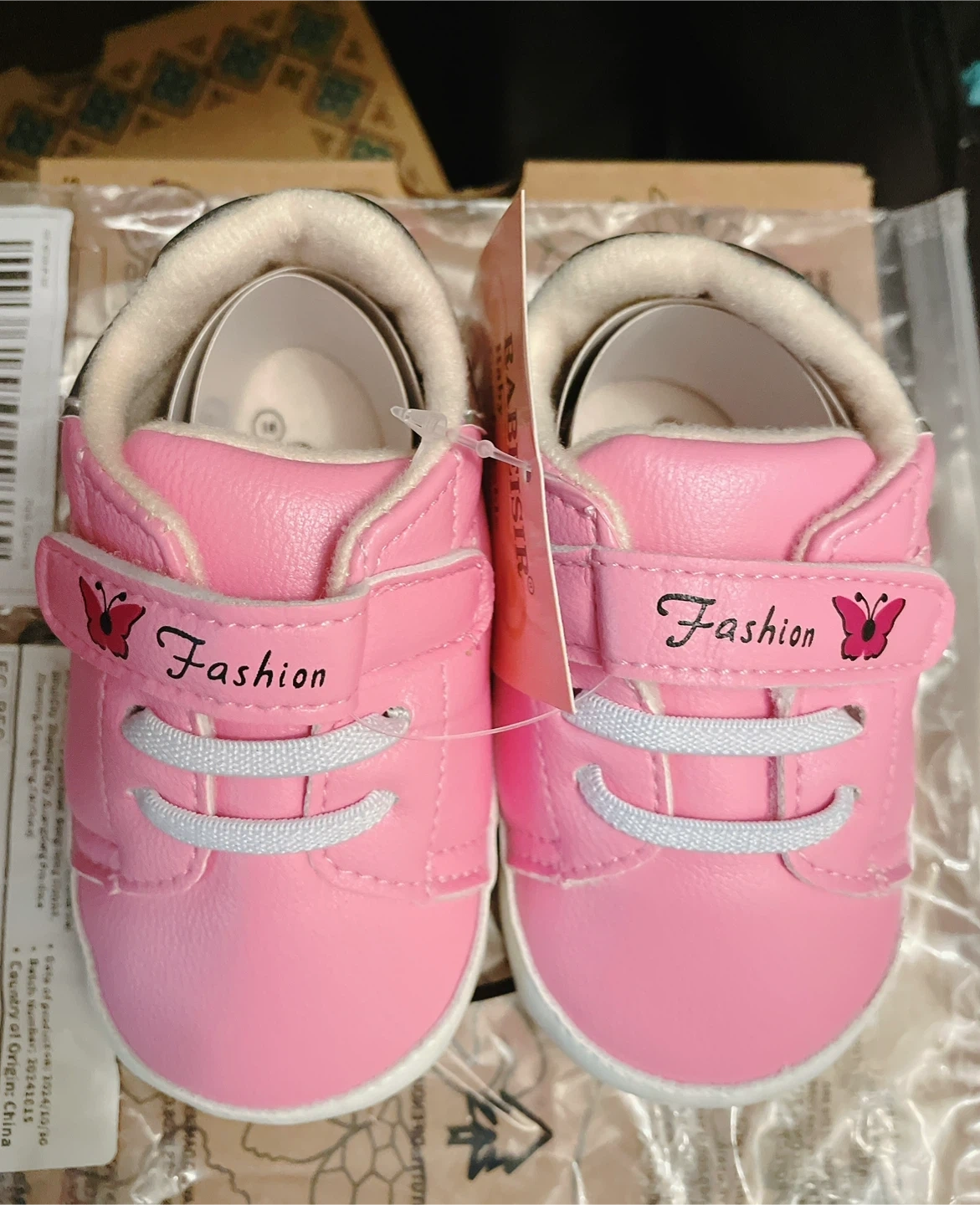 76These adorable brand new baby shoes are perfect for your little one! They are pink and comfortable, ideal for babies aged 6-12 months. They have a cute "Fashion" detail with a butterfly on the strap, making them a stylish choice for your baby's footwear