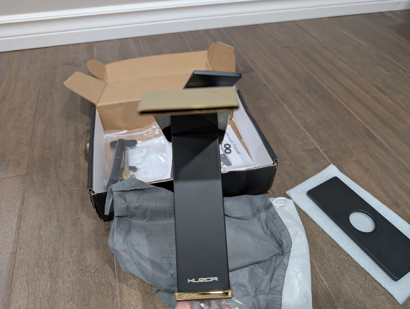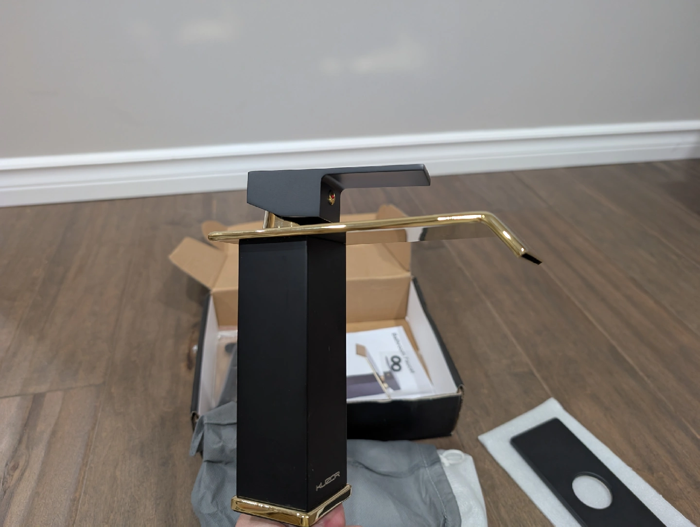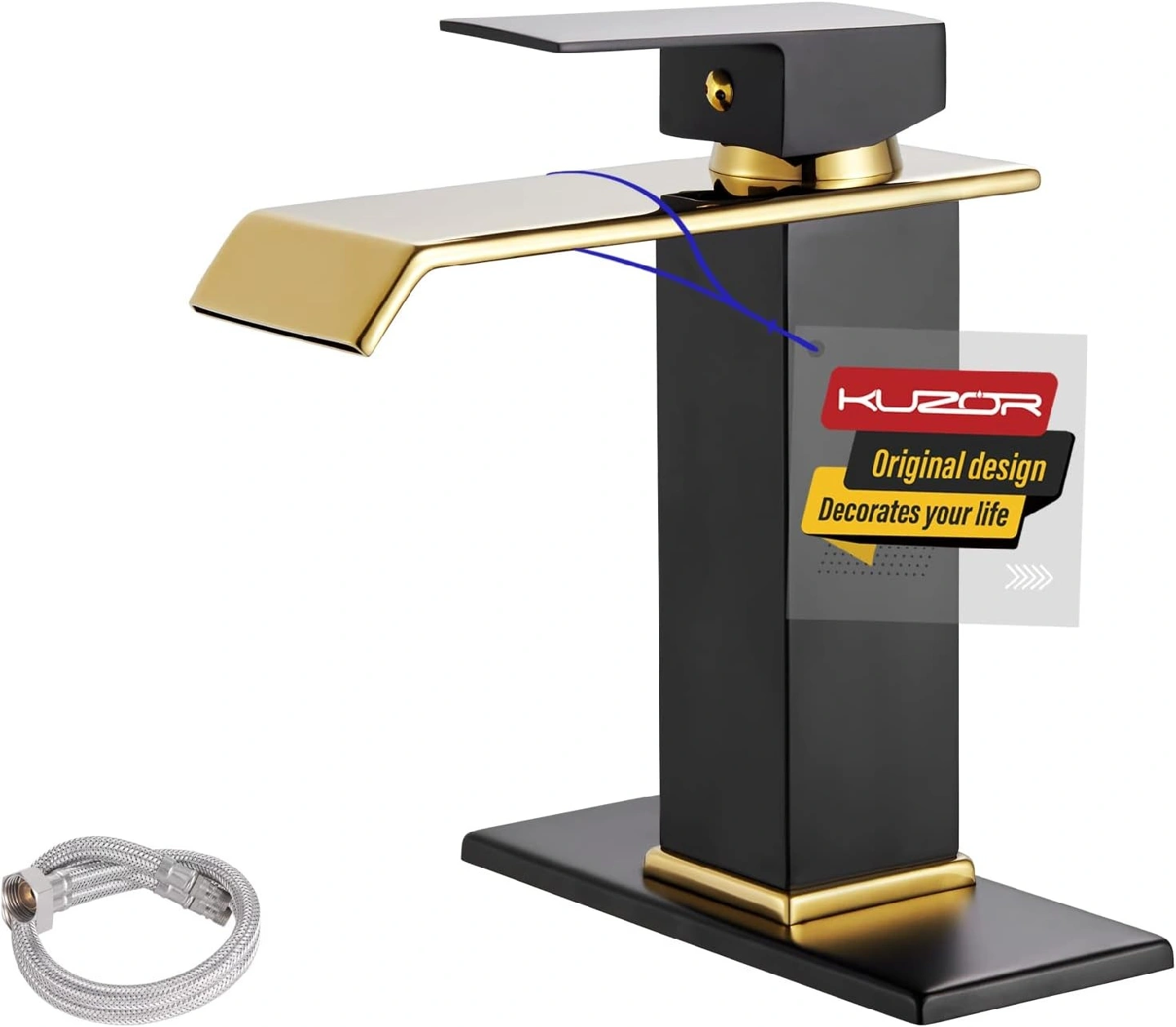 Brand new matte black and gold bathroom waterfall faucet for sale. Plate included, single hole, single handle, stainless steel, $50 FIRM. faucet, water, reno, vanity, counter, water, bathroom, sink, renovation, hose, plumbing, kitchen, drain, shower, tub, bath, bathtub, swivel, pull down, pull out, spray, nozzle, handle, Moen, Delta, dishes, column, tower, massage, jets, LED, temperature, valve, rainfall, waterfall, wand, spout