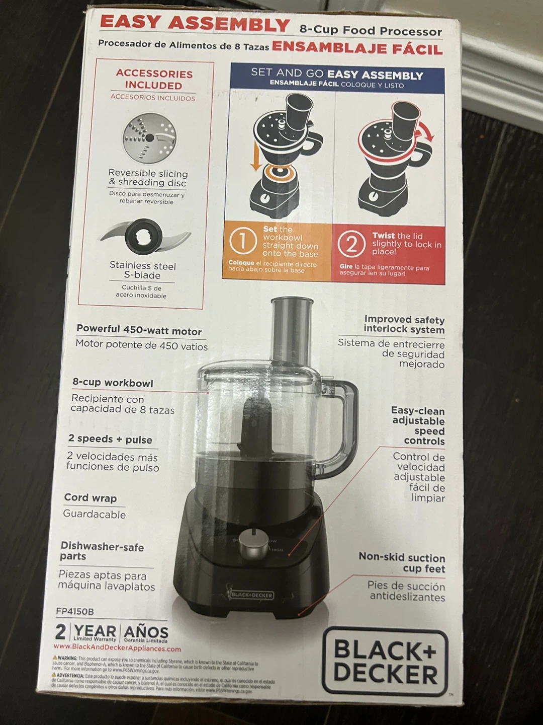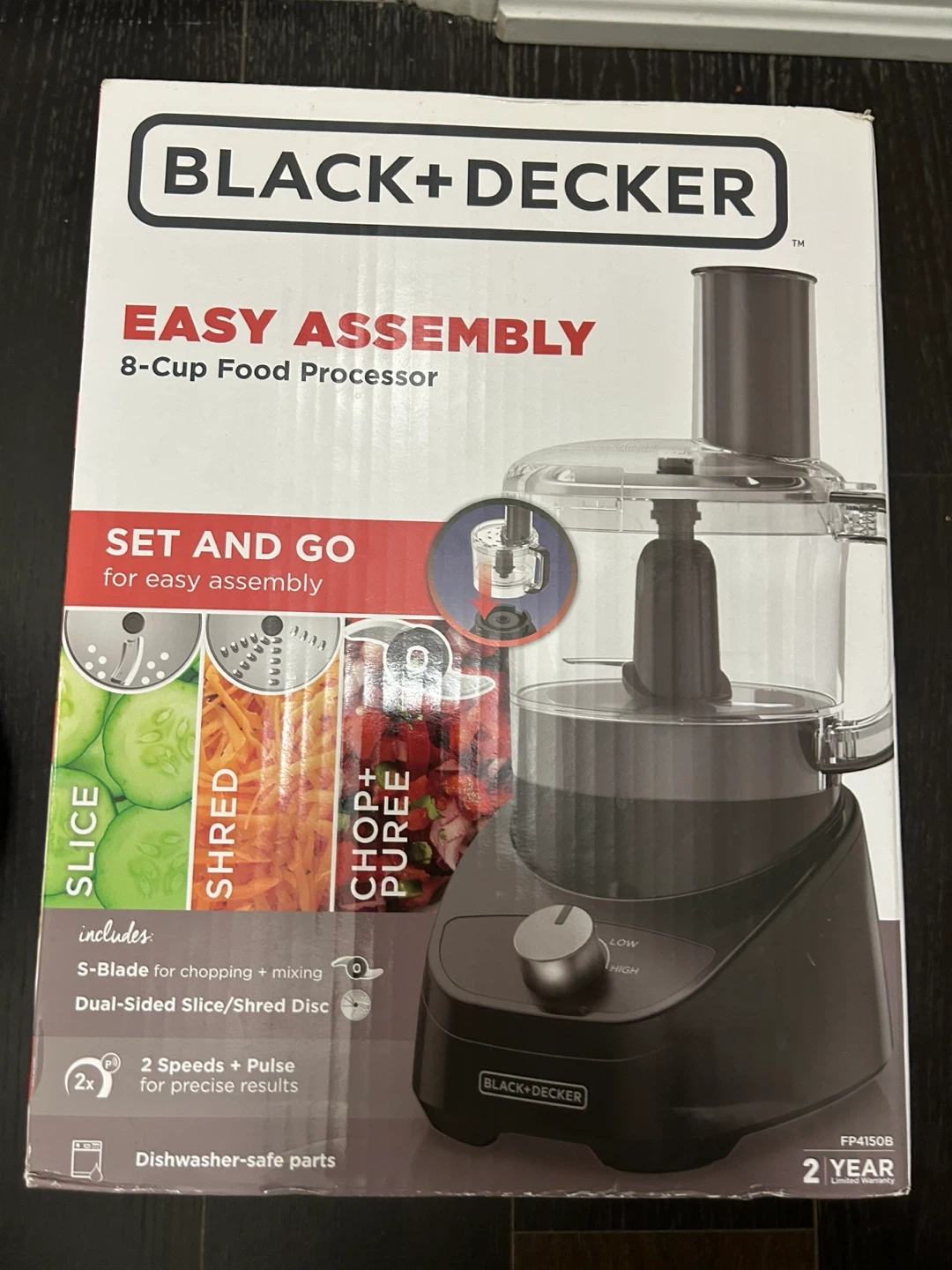 I'm selling a Black+Decker 8-Cup Food Processor. It features easy assembly and comes with a reversible slicing & shredding disc and a stainless steel S-blade. - Powerful 450-watt motor - 8-cup work bowl - 2 speeds + pulse - Cord wrap - Dishwasher-safe parts - Non-skid suction cup feet It also features an improved safety interlock system and easy-clean adjustable speed controls