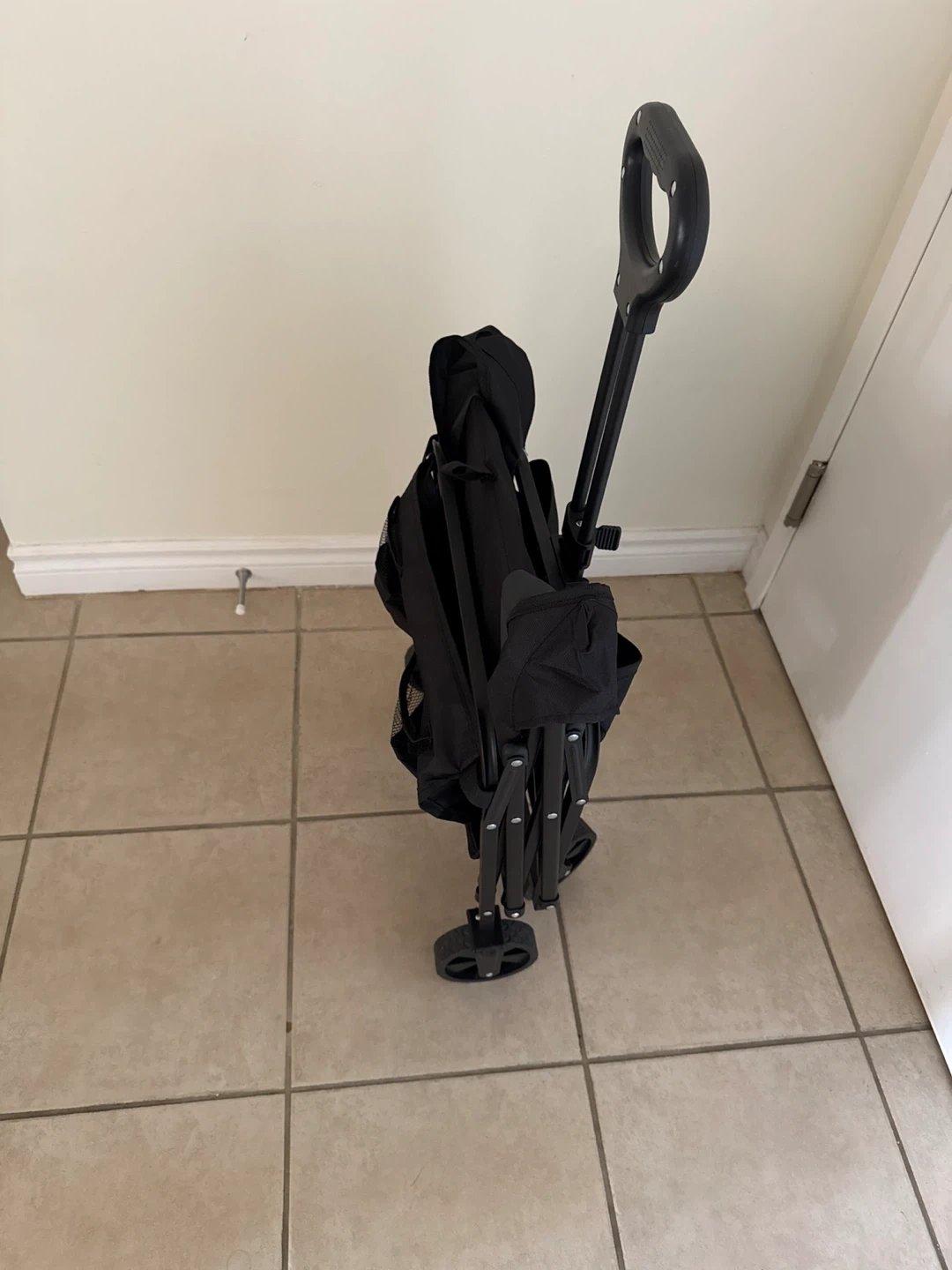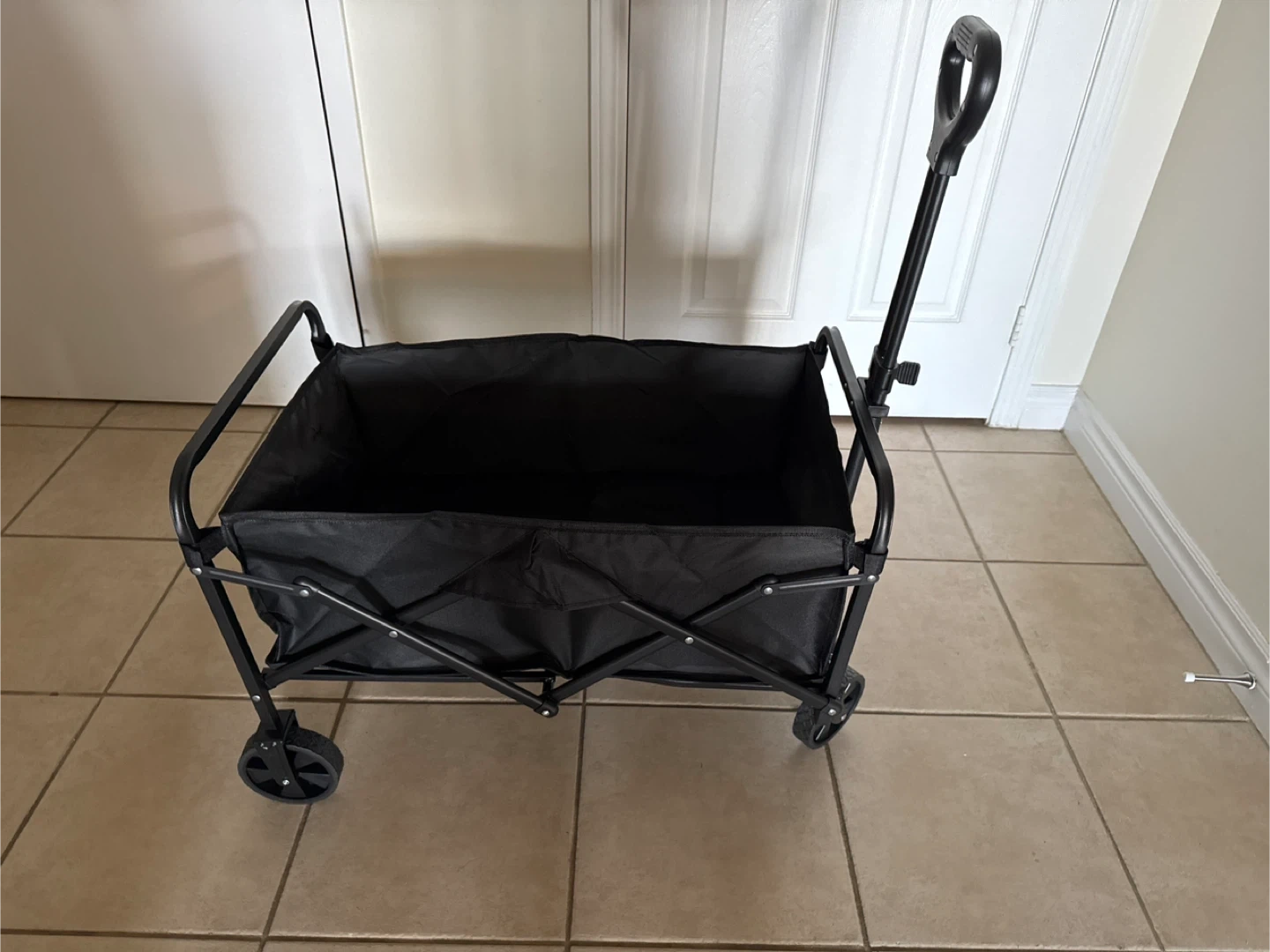 Selling a handy black folding wagon cart! It's perfect for hauling groceries, beach gear, or anything else you need to move around easily. Folds up for compact storage when not in use. Great for camping or outdoor events too! Has two pockets in the back to hold water bottles. Brand new !! Dimensions: approx 26 X 17 X 19 inches