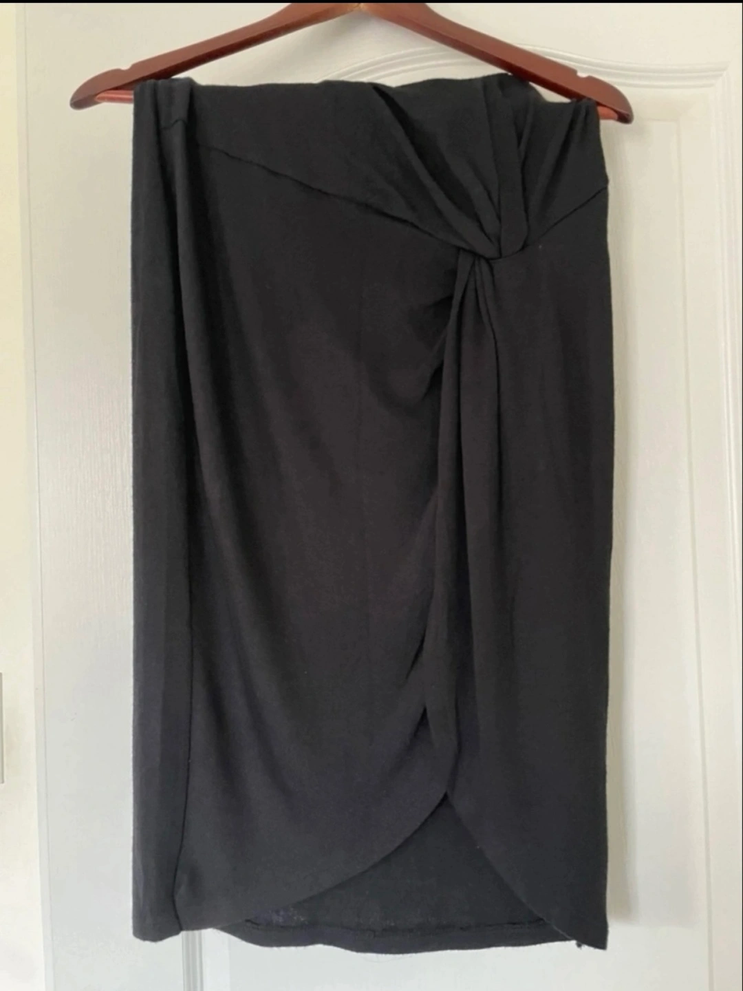 Women's black midi skirt. Features a knotted/twisted front detail. Knee-length. Soft knit material.