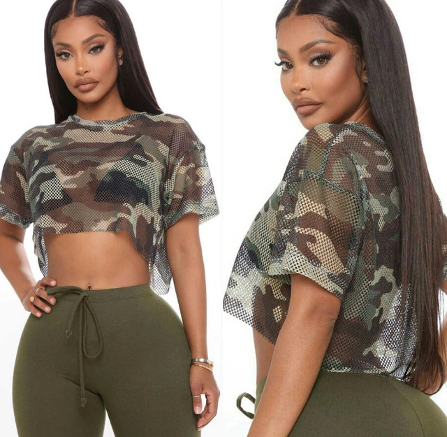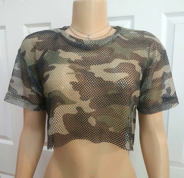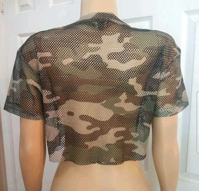25Brand New Camo Fishnet Crop Top Hasn't been worn Size S/M Stretchy & great quality! Located in Aurora