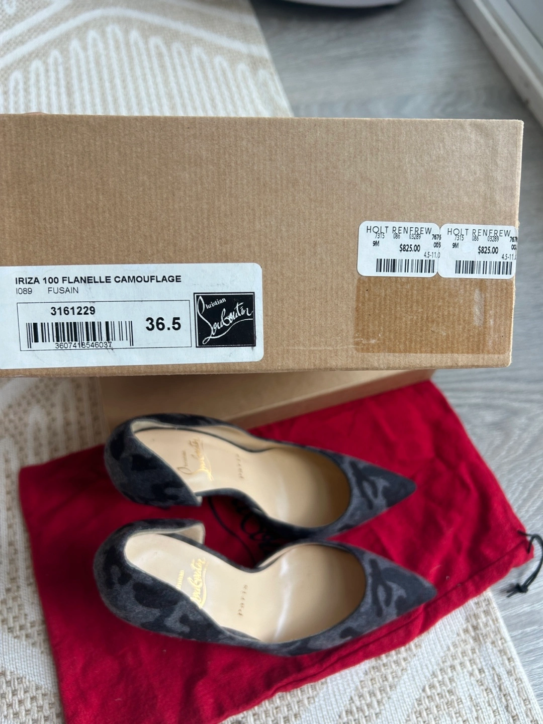 Selling a pair of Christian Louboutin Camouflage heels in size 6.5. *NEVER WORE* . They come with the original box and dust bag. The heels feature a stylish camouflage pattern and the classic Louboutin red sole. Originally bought for $825.00 + Tax at Holt Renfrew!