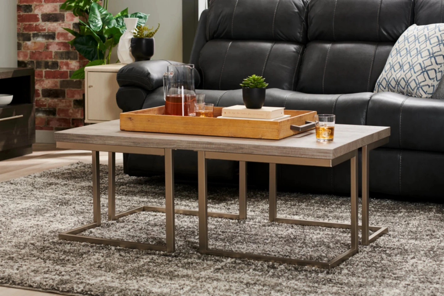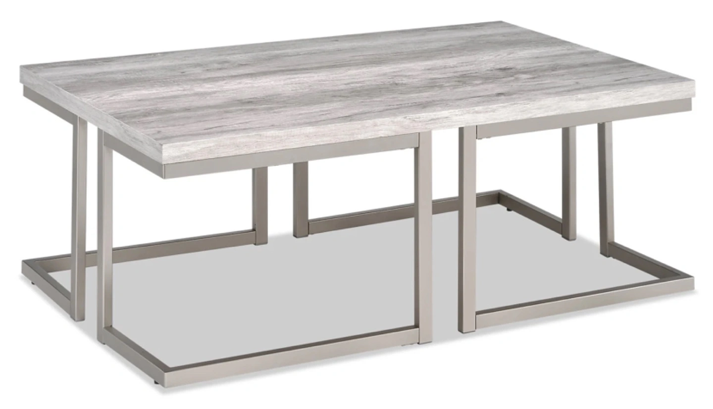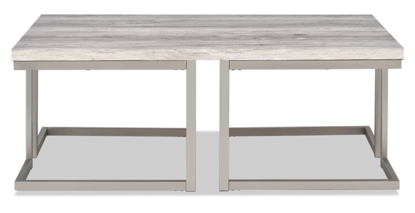 68Selling a coffee table with a grey wood top and a metal frame. It a brand new and unused coffee table (47" Modern Coffee Table - Grey and Pewter with Metal Base). Dimensions: Width: 47" (119.4 cm) Height: 18" (45.7 cm) Depth: 28" (71.1 cm)