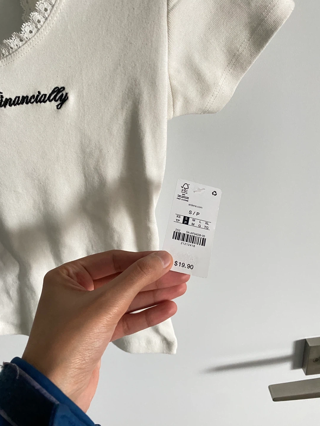 I bought it for $23 with taxes but never wore so it’s brand new with tags on. It features a cute lace trim around the neckline and a tie at the back. The front has the words "Struggling Financially" embroidered on it. It's a size S/P and ❤️ Check out my other listings for great deals!