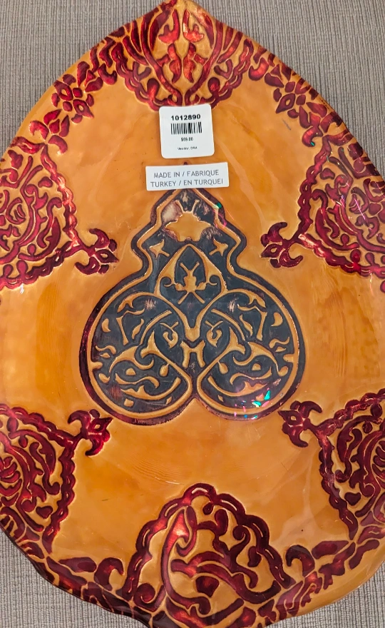 614Beautiful decorative plate, made in Turkey. It has a unique design with gold and red accents. The plate is in great condition and would make a lovely addition to any home