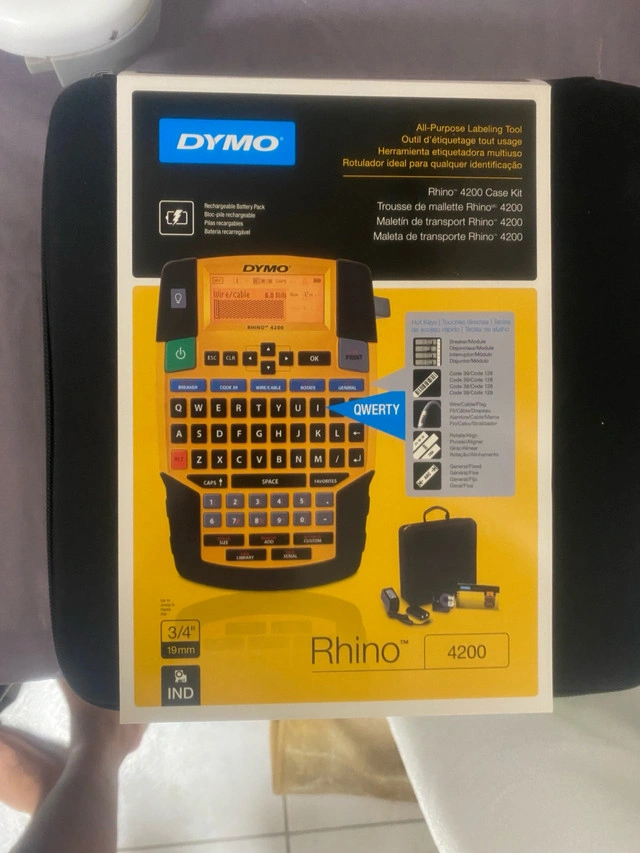 Selling a brand new Dymo Rhino 4200 case kit with a rechargeable battery. I purchased this label maker for work and never ended up needing it. The kit includes the label maker, a Li-ion rechargeable battery, AC adapter, and a 1/2" vinyl label cartridge. I also have an additional brand new rechargeable battery for $45.