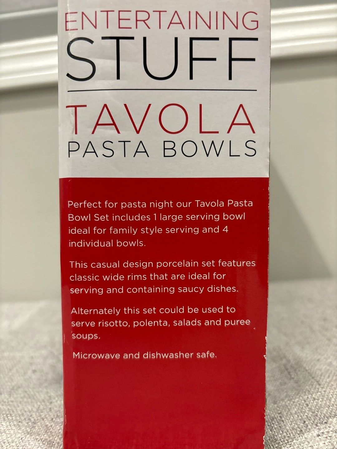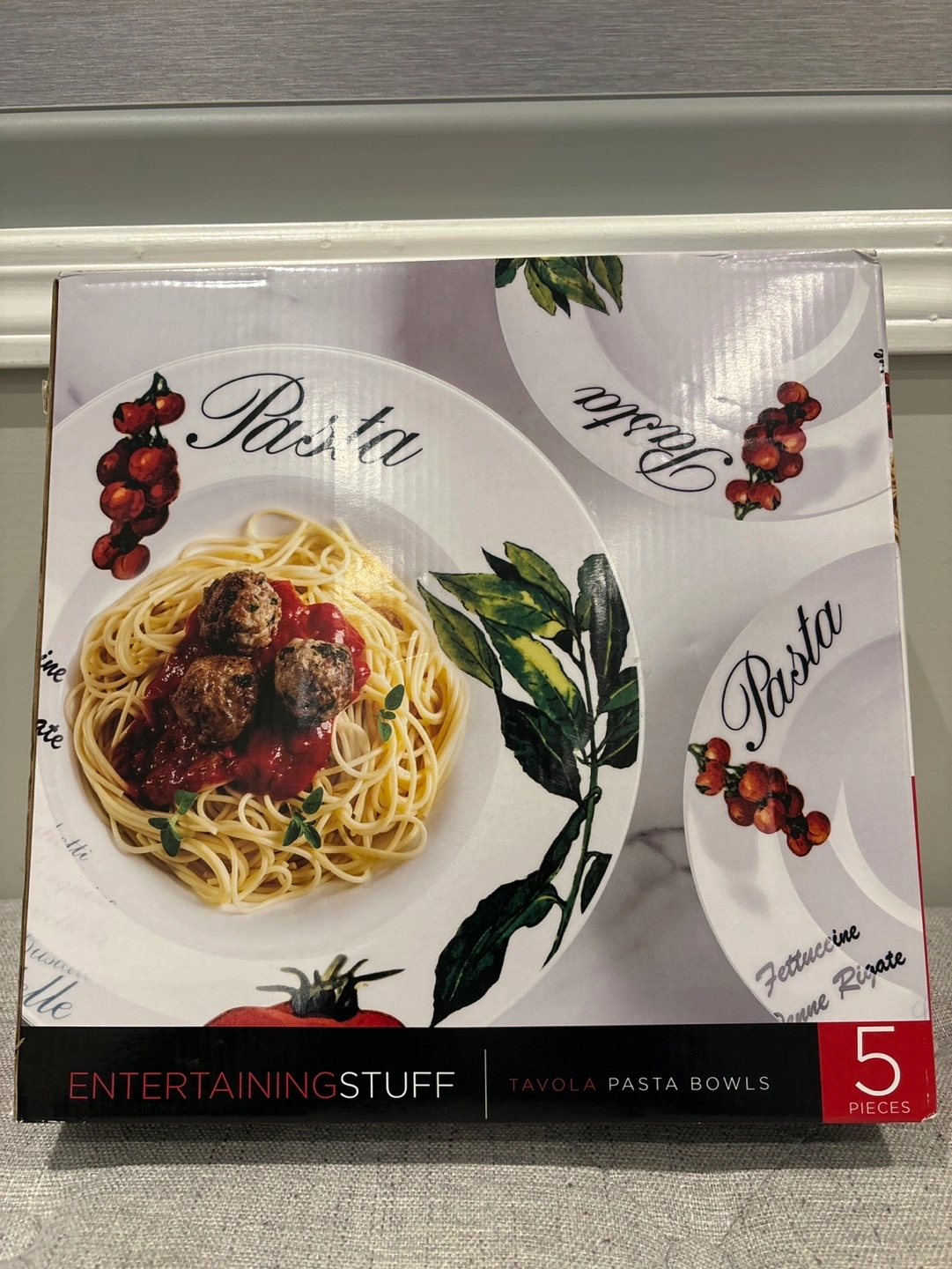 18Set of five pasta bowls, one large serving bowl and four smaller bowls. Microwave and dishwasher safe.