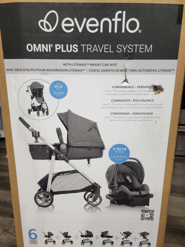 79Selling Brand-new Evenflo Omni Plus Travel System! It can be configured in 6 different ways. - Supports up to 50 lbs (22.6 kg) for the stroller - Supports 3-30 lbs (1.4-13.6 kg) for the car seat - Stroller height is adjustable from 15.7-32 inches (40-81 cm)