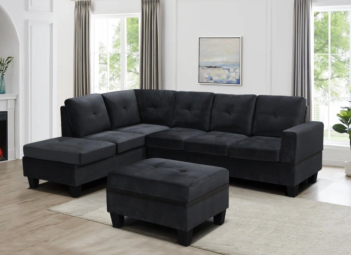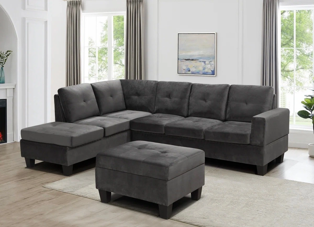 Design: Modern L-shaped sectional with clean lines and tufted back cushions
