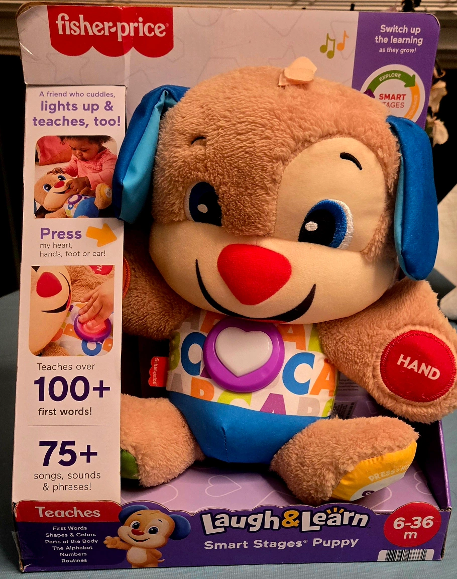 New,in the box ,Interactive plush puppy toy. Features lights, sounds, and songs. Teaches first words, shapes, colours, and the alphabet. Suitable for ages 6-36 months. Smart Stages technology adjusts learning as baby grows.