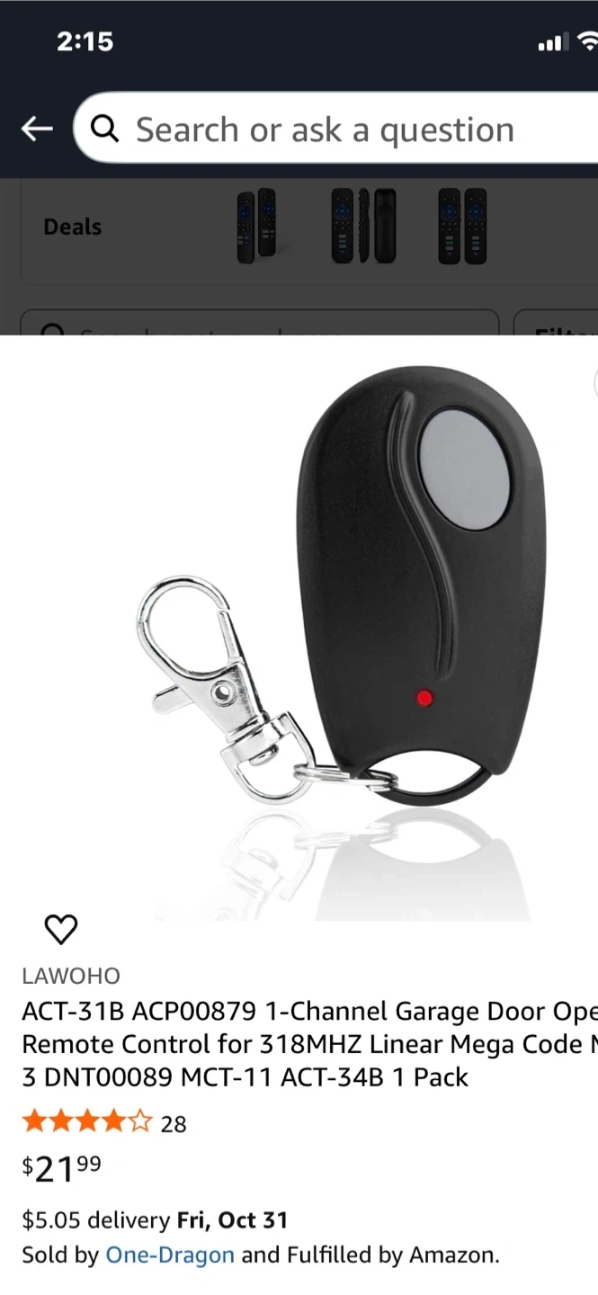 147Selling a brand new LAWOHO garage door opener remote! It's an ACT-31B ACP00879 1-Channel model, compatible with 318MHz Linear Mega Code. It also works with 3 DNT00089 MCT-11 ACT-34B models. Plz save the tax& delivery fee come and get this!π