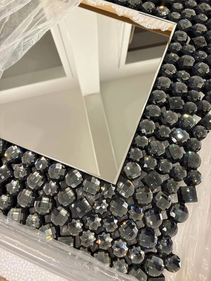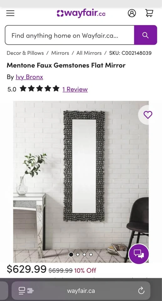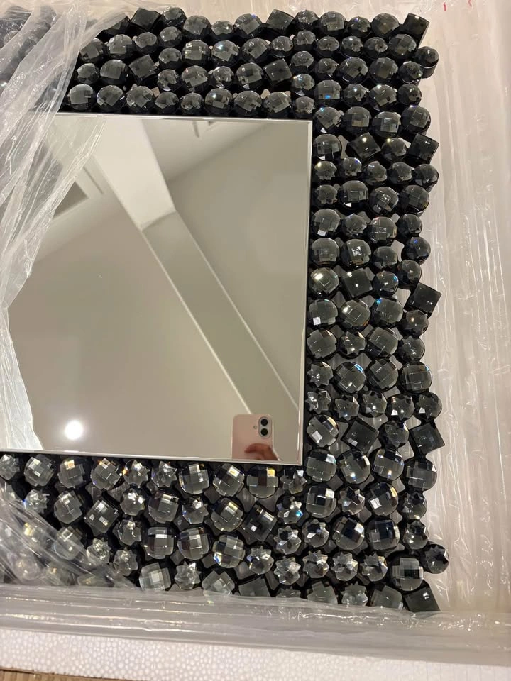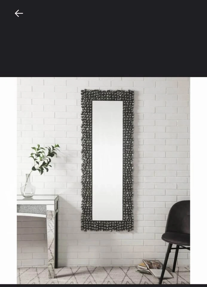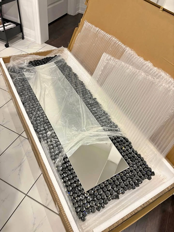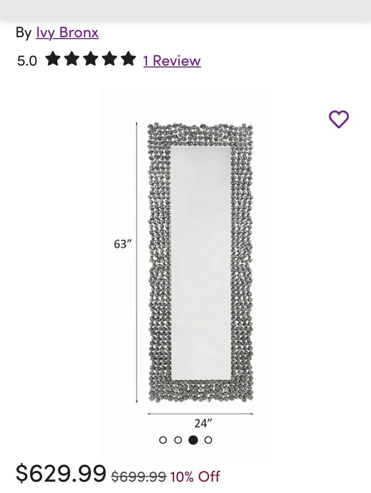 63” Brand new in box Wayfair mirror. Length 63”, Width 24”. You can see the original regular price of this mirror on Wayfair is 699.99+tax. Just opened the box and is still in its original packaging. Its heavy duty and finishing is very beautiful. Gemstones are giving it a Luxurious look. It’s way more beautiful than it’s looking in the pictures.