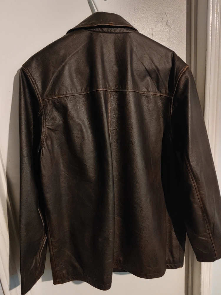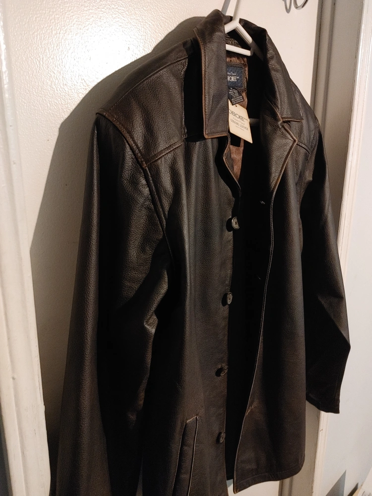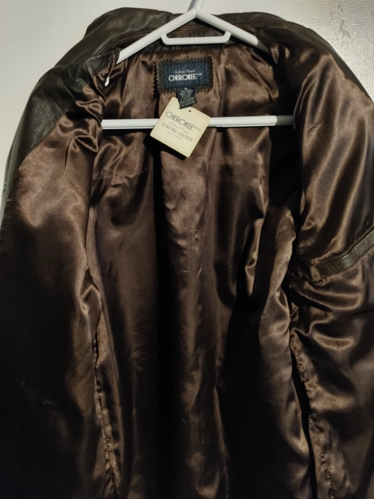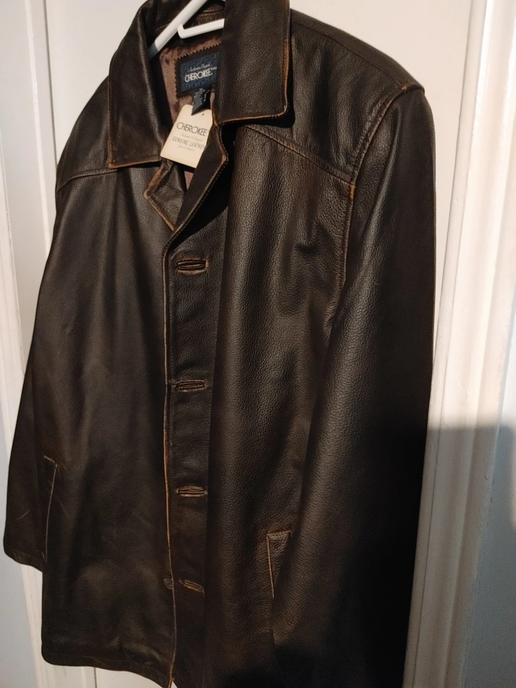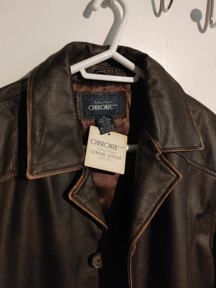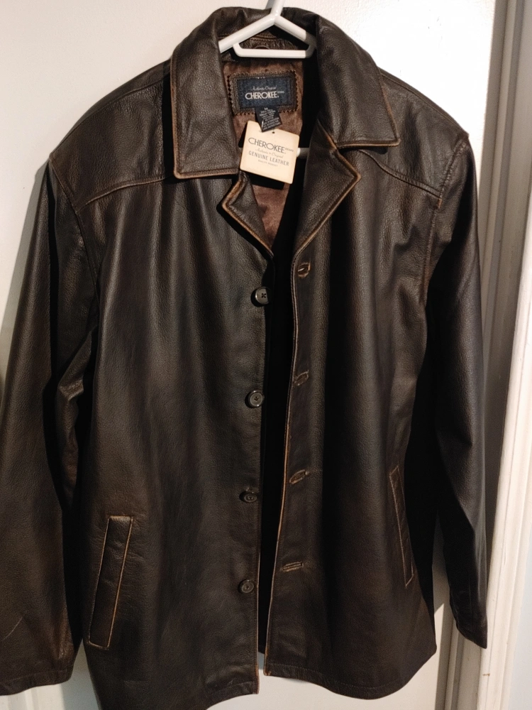 1000+🥕GENUINE CHEROKEE DARK BROWN LEATHER JACKET 🥕HAS ALL ORIGINAL TAGS 🥕SIZE MENS MEDIUM 🥕FOUR BUTTON CLOSURE. NO ZIPPER 🥕CHEST 22 INCHES 🥕LENGTH IS 31 INCHES 🥕SLEEVE LENGTH IS 25.5 INCHES 🥕JACKET BETTER SUITED TO A REGULAR OR TALL SIZED MALE. 🥕I AM LOCATED IN THE YONGE AND STEELES AREA FOR PICKUP ONLY. THANK YOU. ☺️☺️☺️