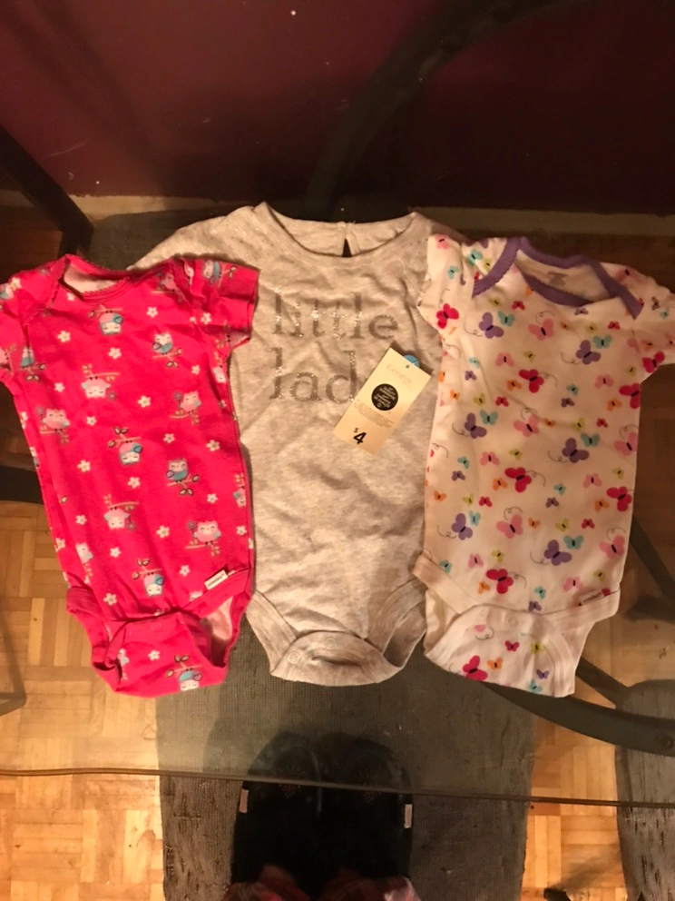 3 Baby onesies, size 12 months One is grey with silver writing, one is pink with owls, one is white with butterflies.all brand new