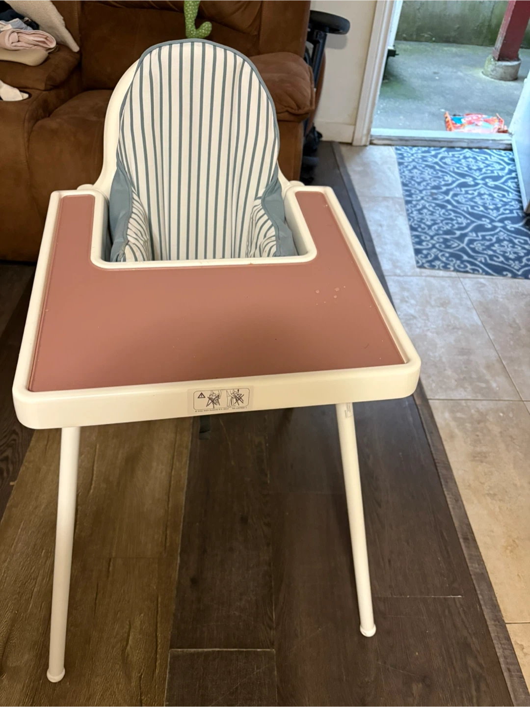 114Selling a high chair with a white frame, pink tray, and striped seat. Barely used like new and ready for a new home!