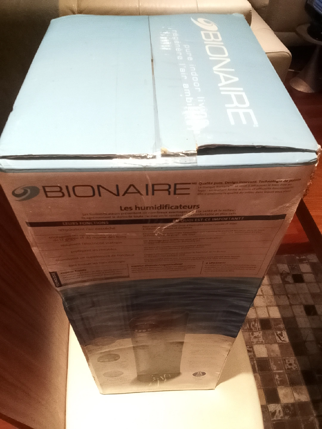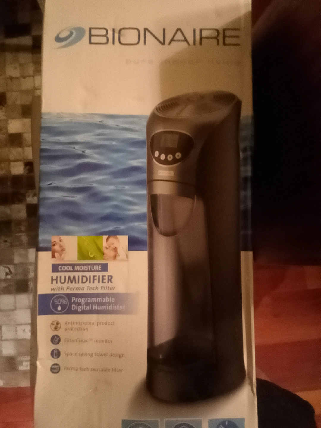 Selling a (Brand New)Bionaire Cool Moisture Humidifier with Perma Tech Filter. It features 50% digital humidistat, antimicrobial product protection, and a FilterClean monitor. Also has a space-saving tower design and a Perma Tech reusable filter. Comes with the original box! *Cash & pick up only