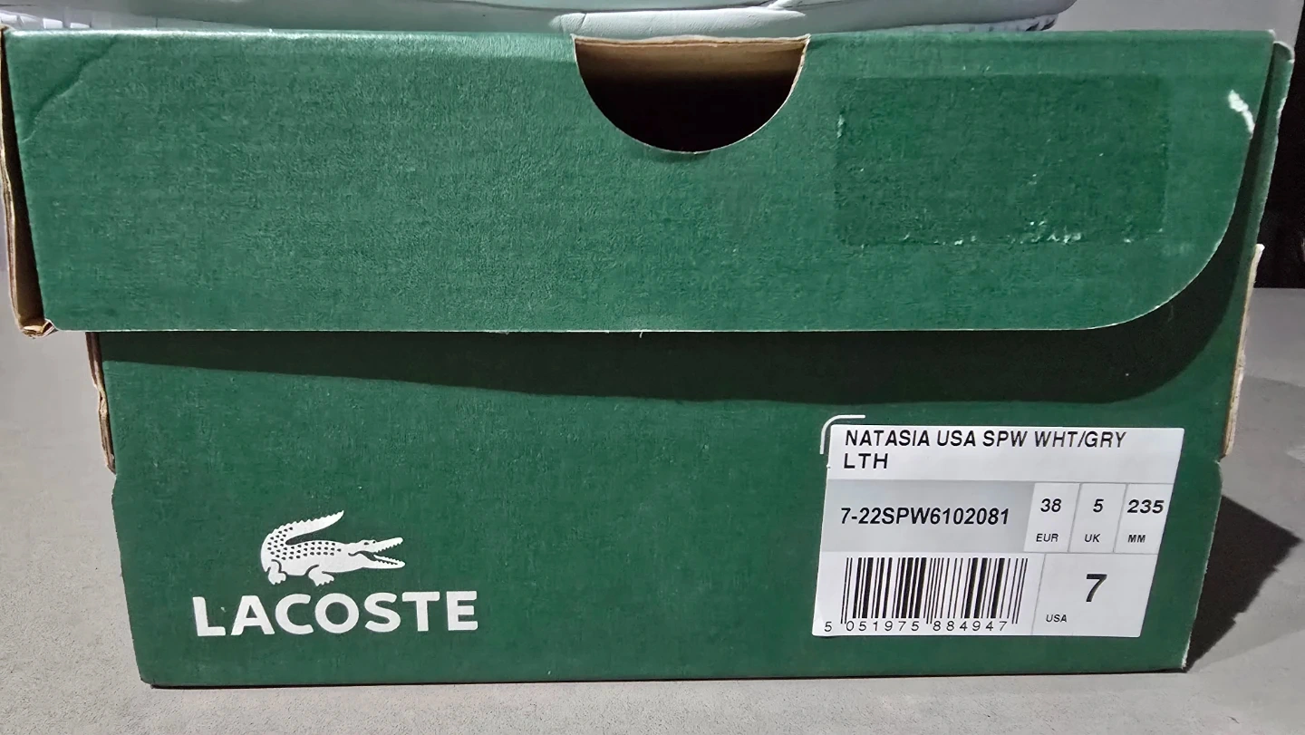 18Btand New, never worn Ladies Lacoste Natasia USA SPW WHT/GRY shoes in a size 7. Perfect for everyday wear!