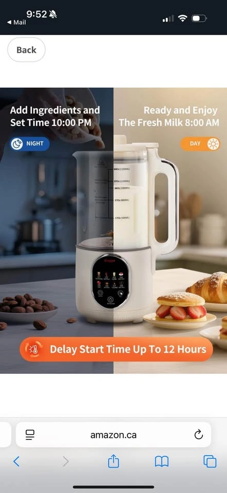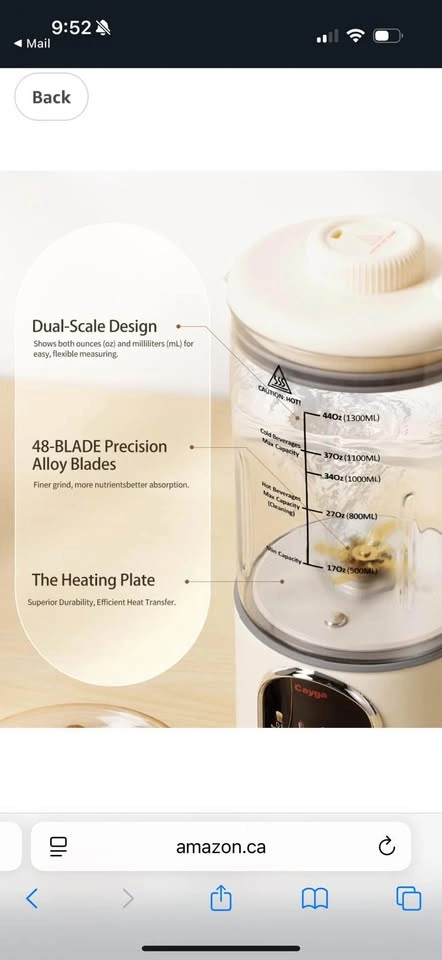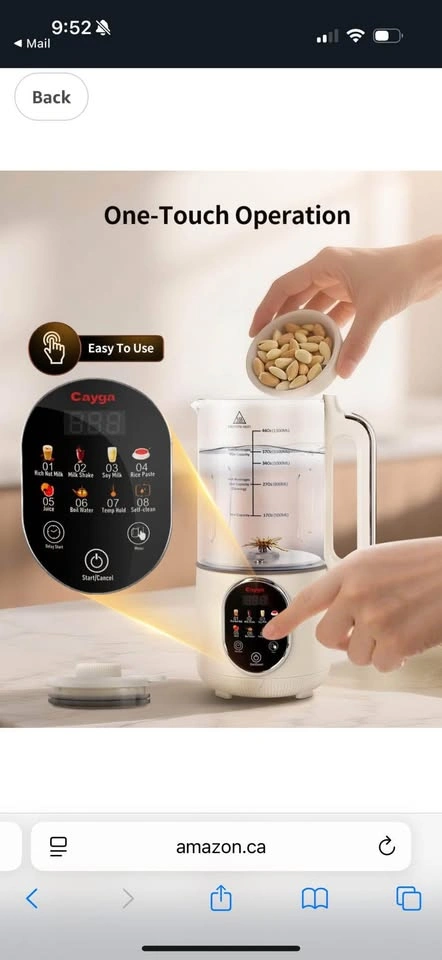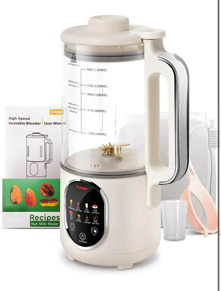 This Cayga nut milk maker features 48 blades and a heating plate, providing exceptional durability and performance. The high-quality materials ensure long-lasting reliability and efficient operation, allowing you to enjoy fresh beverages with ease. Our Cayga soy milk maker machine makes enough plant-based milk and smoothies in one batch to serve a group. It can make up to 37 ounces (1100ml) of cold drinks (nut milk, juice), and up to 27 ounces (800ml) of hot drinks (soy milk, porridge, soup). Whether for breakfast or a family gathering, it’s easy to provide healthy drinks for all. Not only does it make nut milk, but this soybean milk maker also creates oat milk, soy milk, rice porridge, and more. It's a mixer with both blending and boiling functions, allowing you to boil water for hot beverages. Whether you're preparing plant-based milk (including almond milk, cashew milk, coconut milk, or multigrain milk), smoothies, juices, or other drinks. Set the 12-hour smart timer to have fresh, warm beverages ready when you wake up. You can schedule your milk-making in advance, and the 4-hour keep-warm feature ensures your drink stays at the perfect temperature of 140°F (60°C), ready whenever you are. Whether for personal use or as a thoughtful gift, our Cayga almond milk maker is a practical and stylish choice that embraces a healthier, more sustainable lifestyle. The package includes everything you need for a seamless experience: 1*Nut Milk Maker, 1*Power Cord, 1*Measuring Cup, 1*Instruction Manual, 1*Recipe Book, 1*Fine Mesh Strainer, 1*Nut Milk Bag, 1*Cleaning Brush