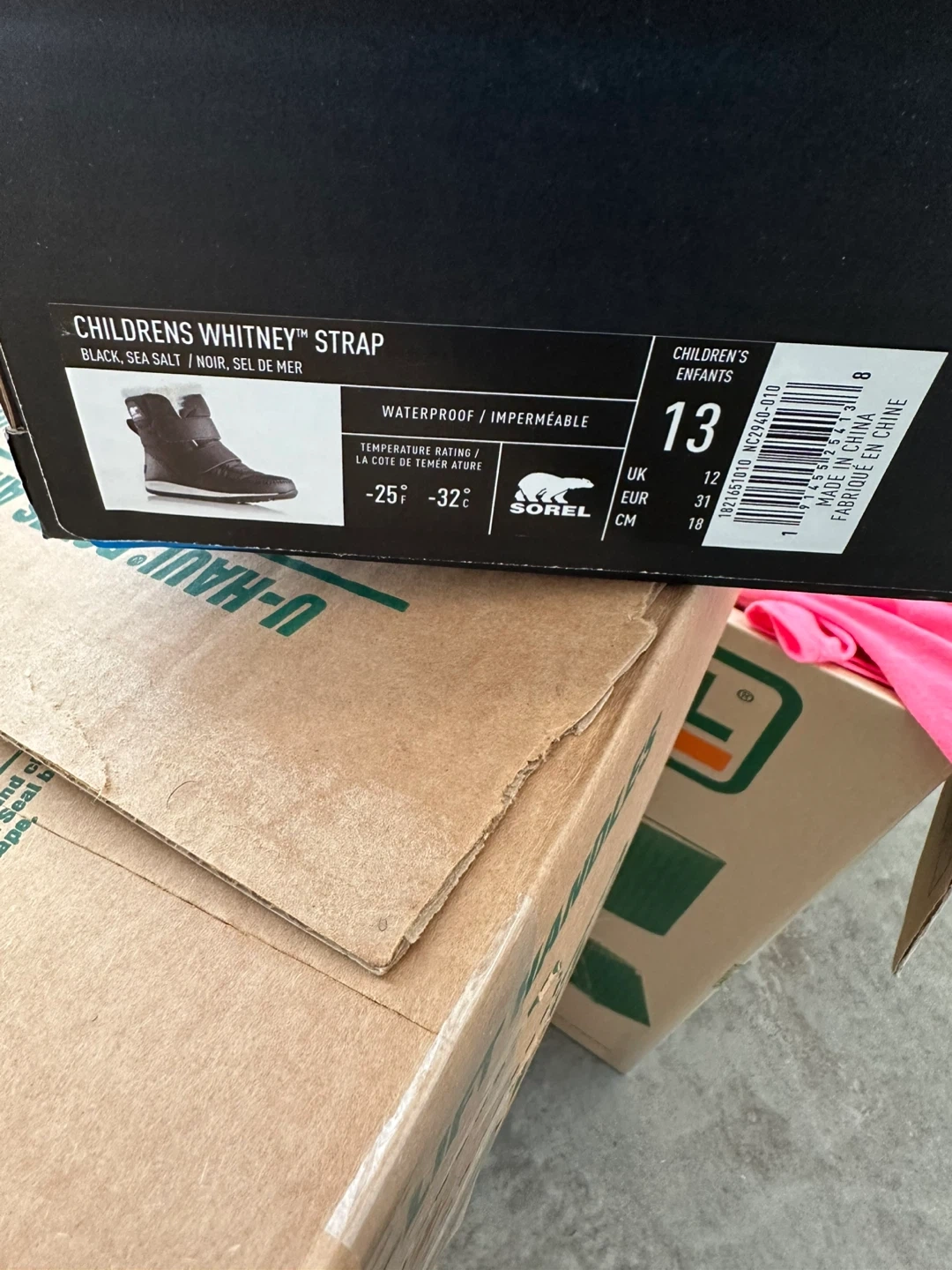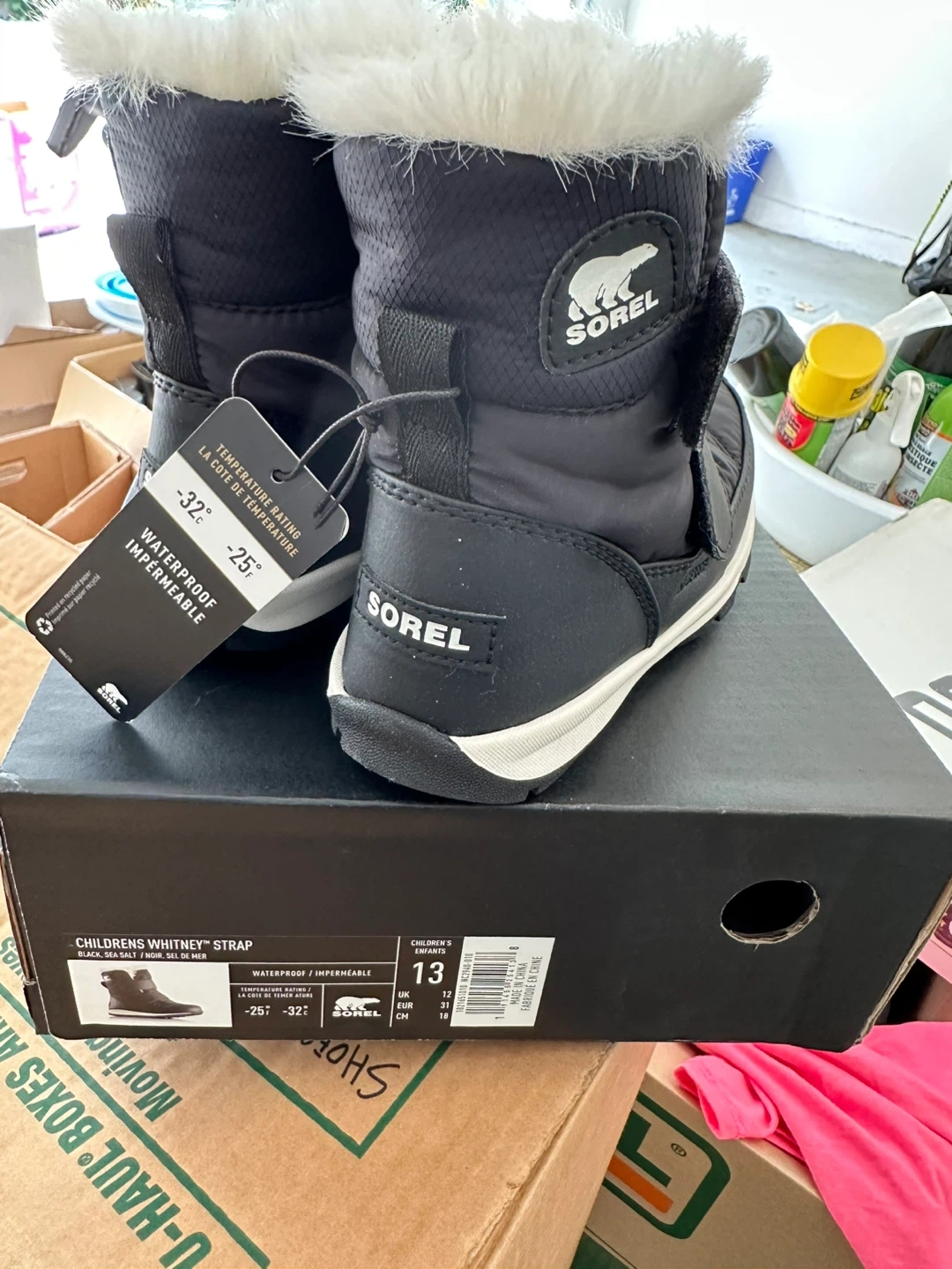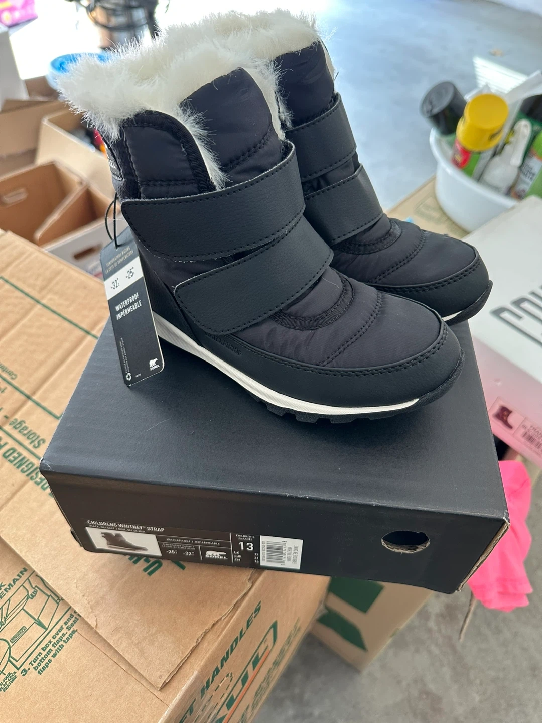 Brand new in box! These Sorel Childrens Whitney Strap boots are brand new and ready for some winter fun! They are black and sea salt colour. These are a children's size US13 and are waterproof, perfect for keeping little feet dry and warm. They are rated for temperatures down to -32°C