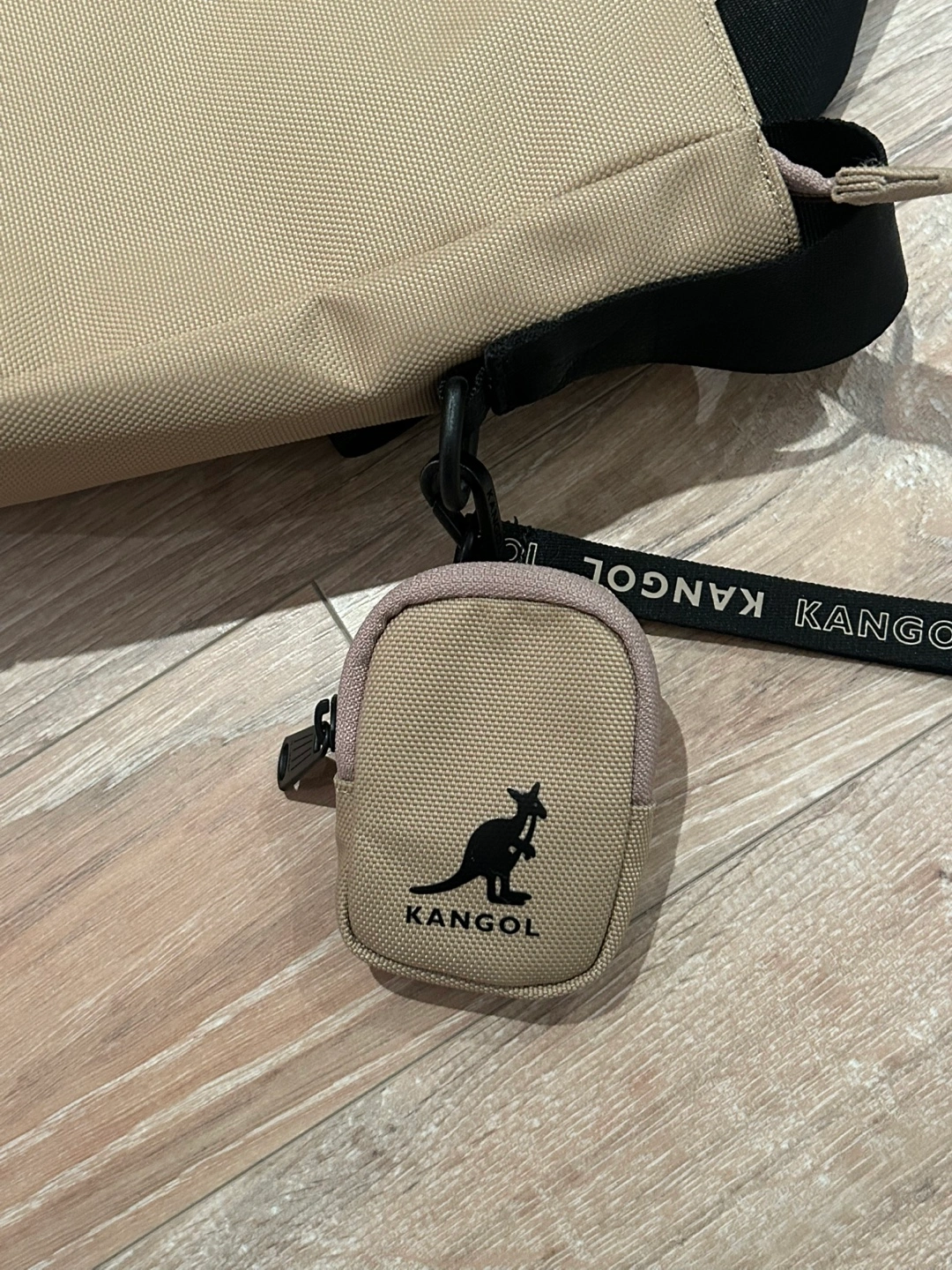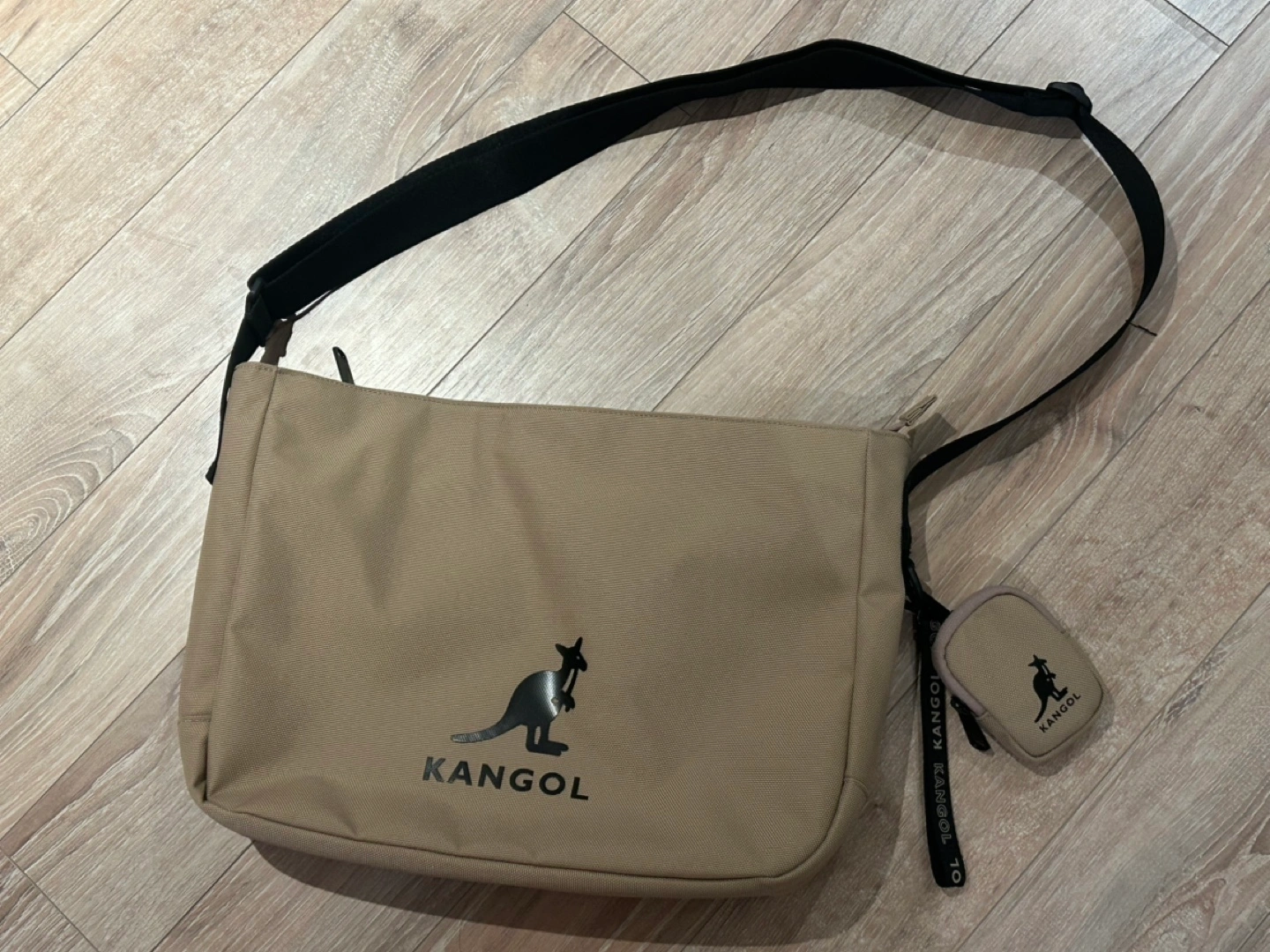 78Beige shoulder bag with a detachable (AirPods) pouch. The bag has an adjustable strap and a zip closure. It fits any laptop so it’s useful.